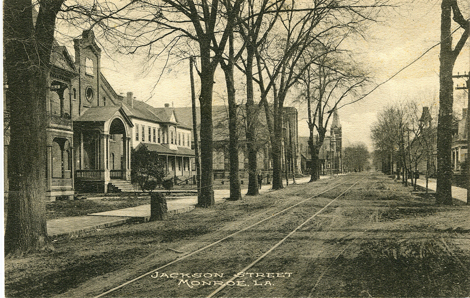 This is one of my favorite old photos of Monroe! What you are looking at, is a shot down Jackson street. On the left you can see the Jewish Temple with the ten commandment tablets at the top. the white building is St. Hyacinth Catholic School, with St. Mathew Church sitting next to it. Notice it doesn’t have a steeple. Down the way is the ME Church. Jackson is unpaved and the trolley tracks run down the center. Such a fascinating photo!