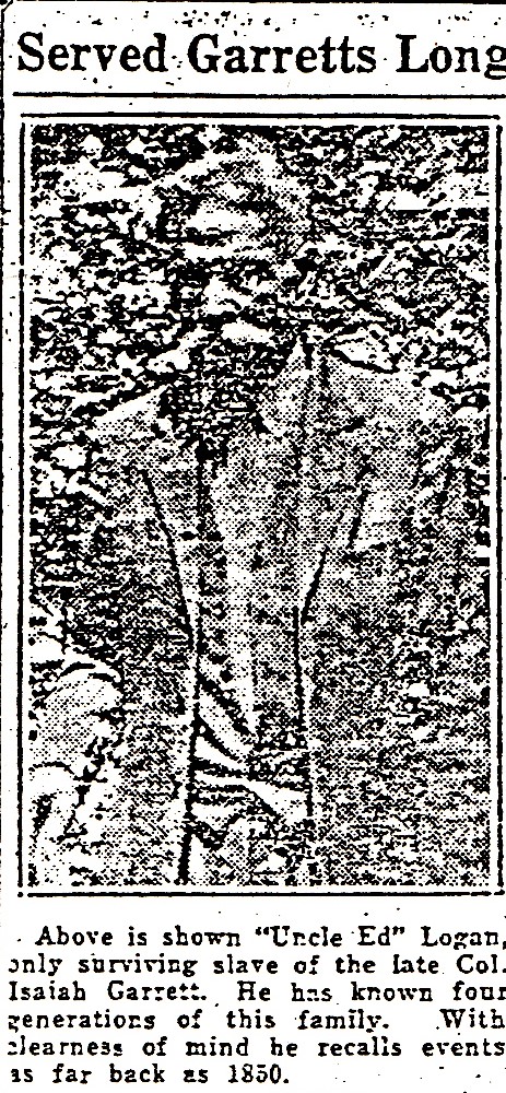 “Uncle” Ed Logan, only surviving slave of the large number once owned by Col. Isaiah Garrett, one-time wealthy attorney and plantation owner of this section, doesn’t know how old he is, but he has known four generations of Garretts. he remembers distinctly incidents which occurred in 1850 or earlier. David I. Garrett, district attorney, and grandson of Col. Isaiah Garrett, is convinced from incidents which “Uncle” Ed recalls, that the old negro must be fully 90 years of age.