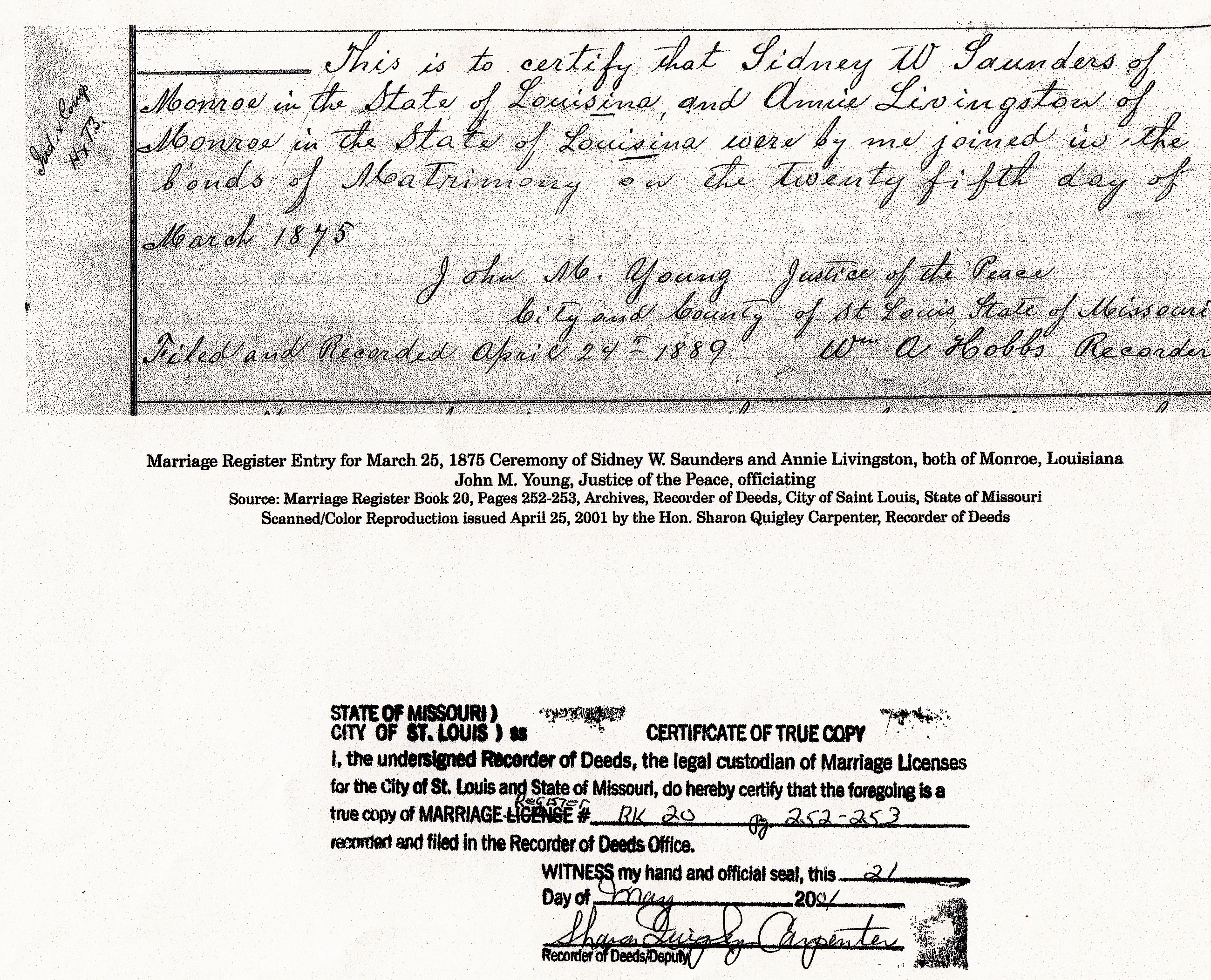 Historians still claimed it is fake. I emailed Ms Carpenter (recorder of deeds) and told her the story. She stated it was not unusual for it to take days, months or even years to go to the courthouse and registering the marriage! In fact, she stated the register was more legal than the license, even if it was ever found (the license is missing)! It is still awful fishy that it was registered after Sidney’s death!