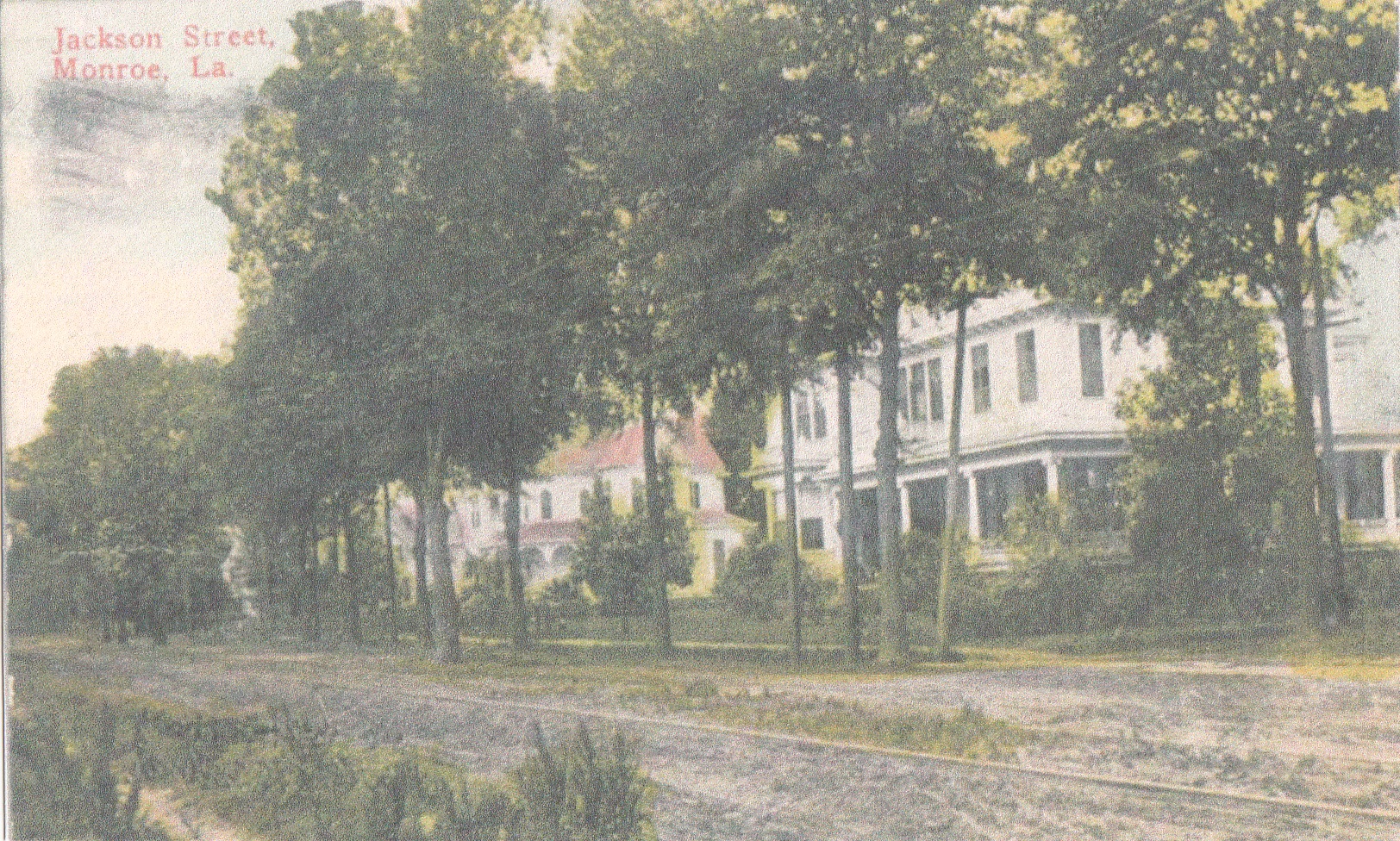 This is a copy of an old postcard from the collection of the Ouachita Parish Public Library. I don’t know exactly where on Jackson street this was. I can tell it dates to around 1910. The trolley lines were put in around 1906 and the street isn’t paved. Aren’t those houses beautiful?