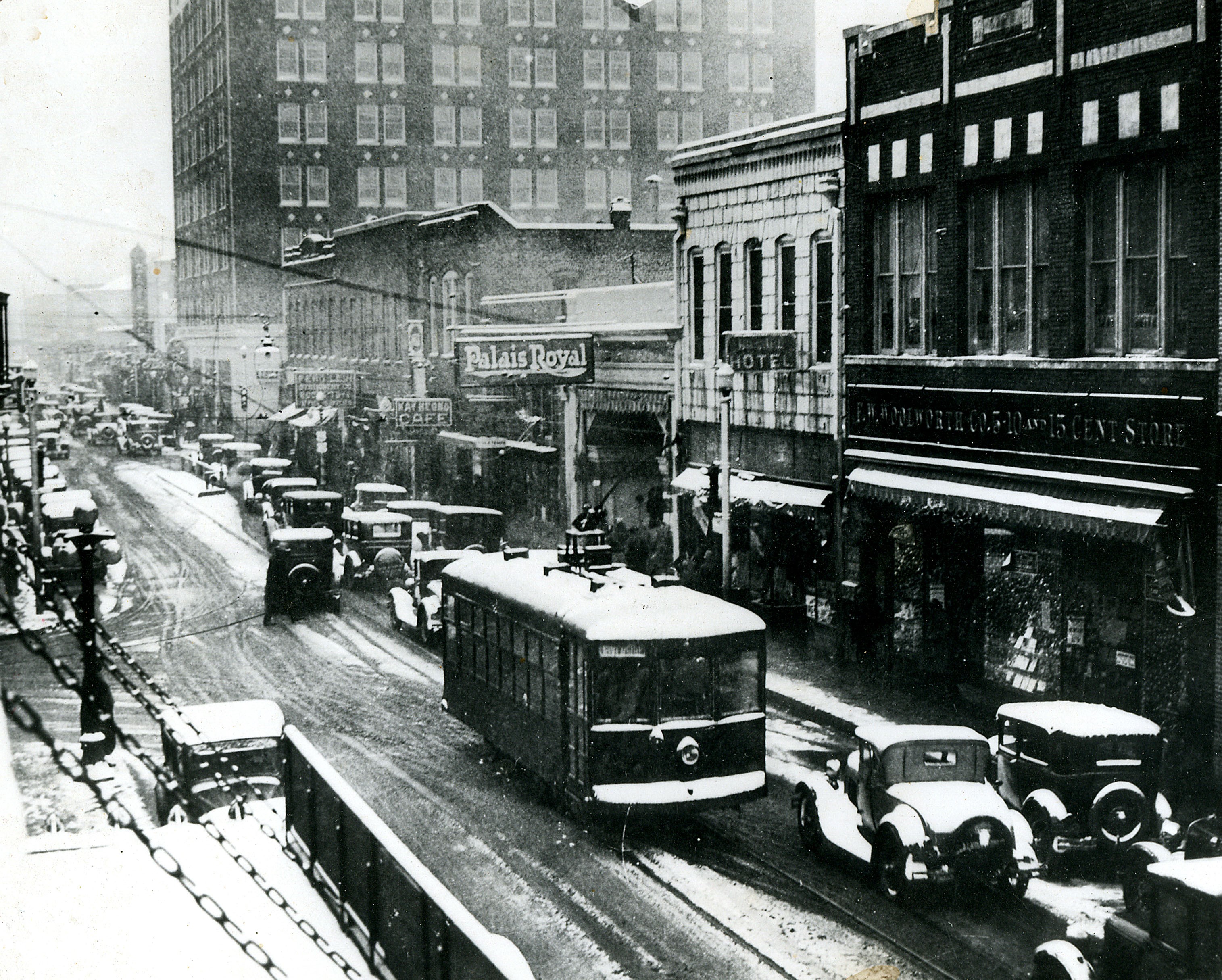 A few weeks back, I shared a photo of a street scene at the corner of DeSiard and Jackson Street. This is the same spot but at a different angle. You can see the Palais Royal, The F.W. Woolworth Building and the Willard Hotel. The Bernhardt building is seen in the distance.
