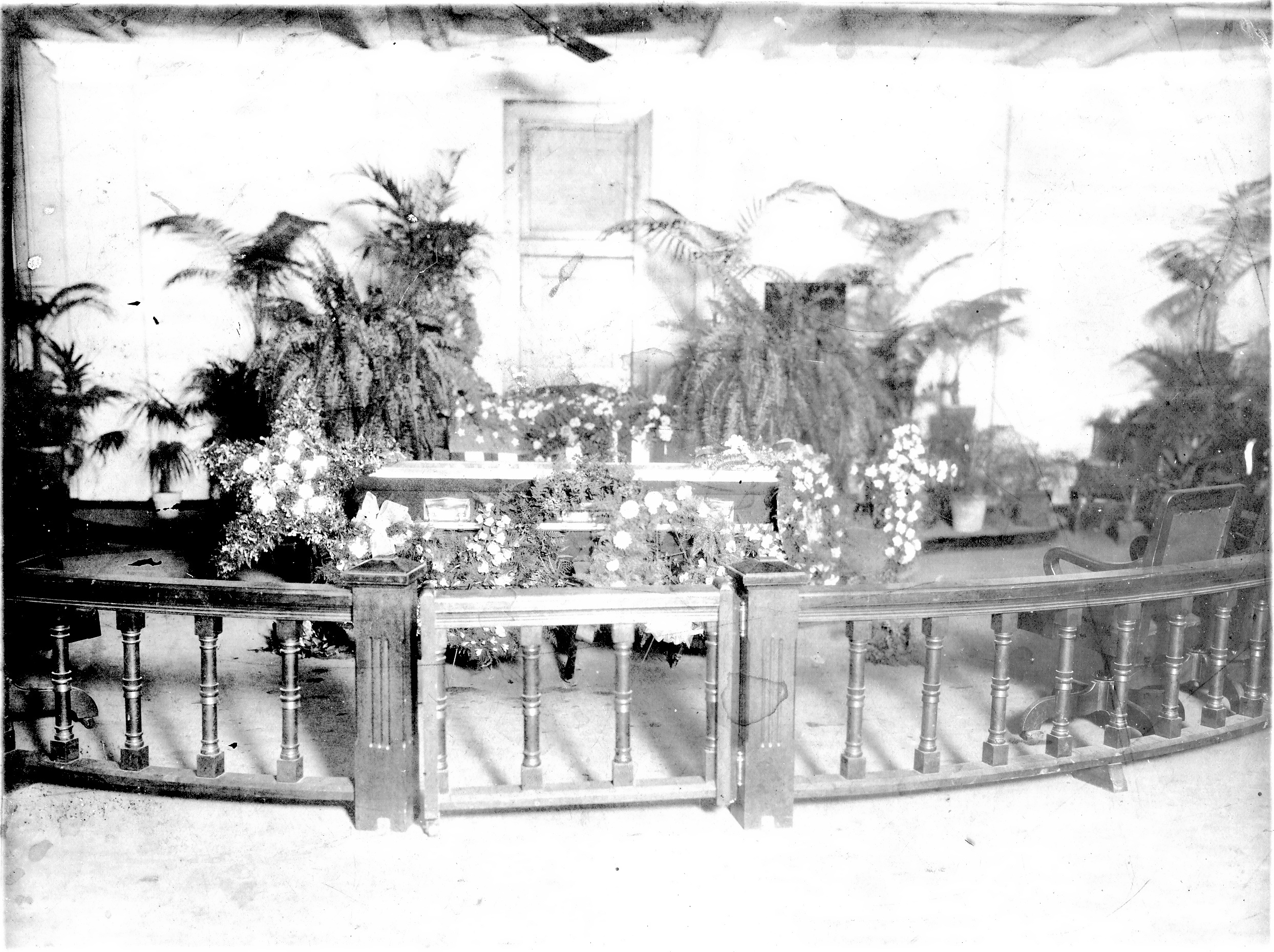 The above photo is from the collection of the Ouachita Parish Public Library’s Genealogy and Special Collections Department. It shows the coffin and funeral offerings for Mayor Andrew Alexander Forsythe lying in state in Monroe’s City Hall. Mayor Forsythe had passed away on September 29, 1914. He was buried in a lavish ceremony in Monroe’s Old City Cemetery.