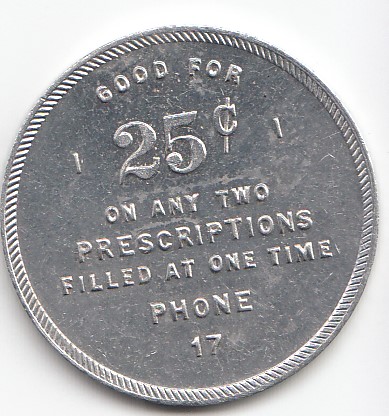 This is a token in my personal collection from the old Collens Five Points Pharmacy on DeSiard Street. You could use it two ways!
