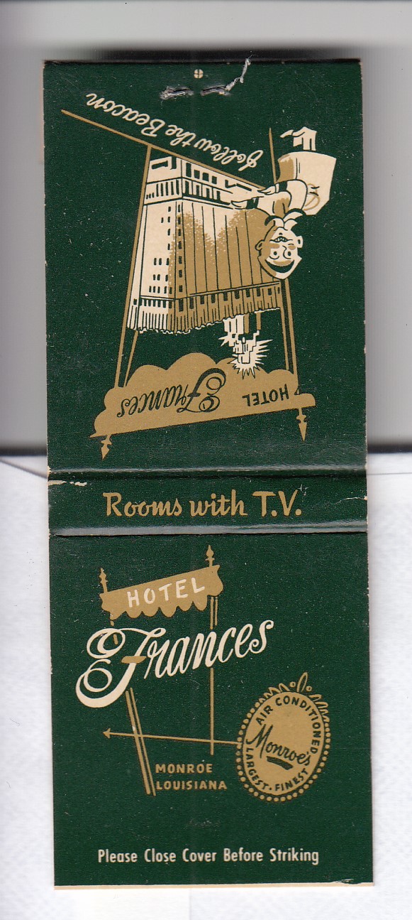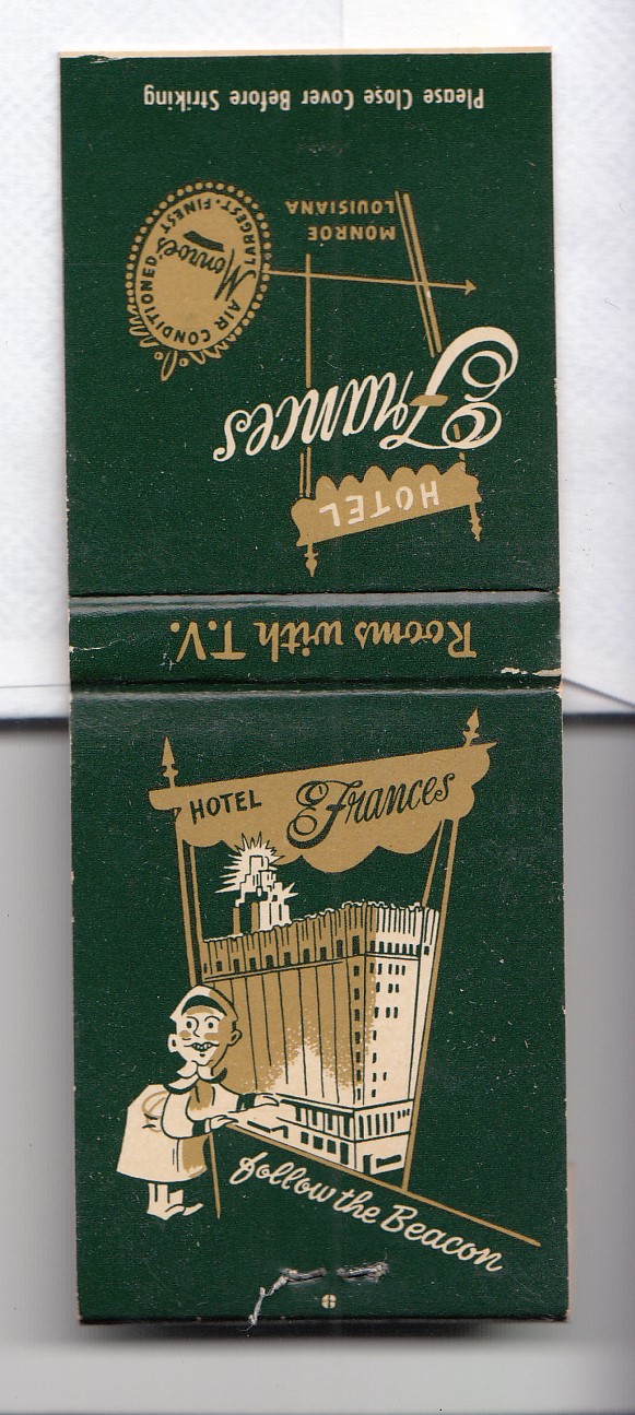 This is another object from my collection. It is a matchbook from the Frances Hotel. It still has all of it’s matches! The slogan, “follow the Beacon” is a reference to the bright red light on the top of the hotel. I have been told it could be seen for miles. You knew you were close to home once you saw the beacon!