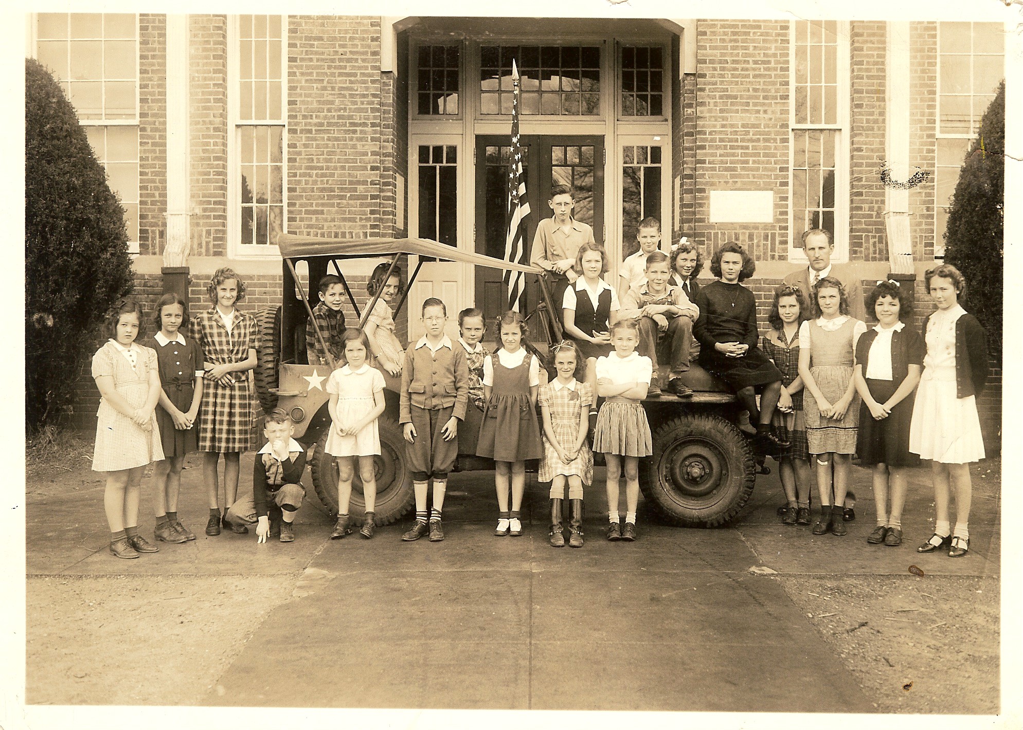 The above photo is identified as “Crosley Jeep Campaign”. The older adults are probably the teacher and principal. It was probably taken during some fundraiser during WWII. That is all we know! Do you recognize anyone in the photo?