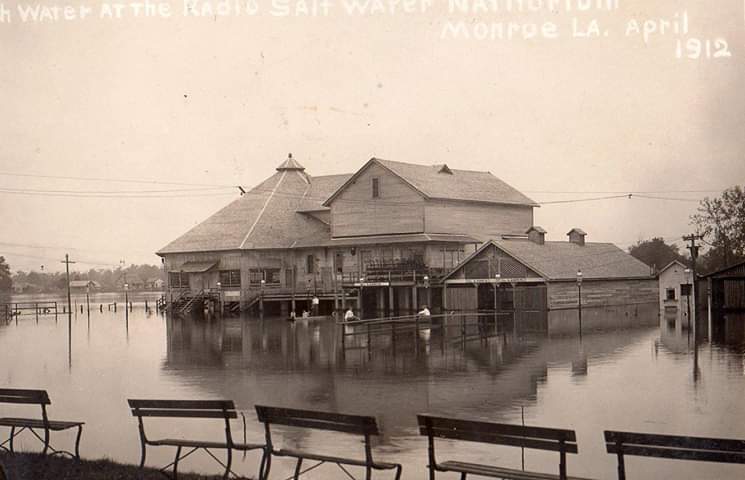 Very interesting shot of the flooded Salt Water Natatorium at Forsythe park, dated 1912. The pavilion would eventually be lost to a fire, but it would be another flood, the 1932 flood, that would ultimately take out the natatorium. It was decided Monroe needed a levee system and the pool was covered over.