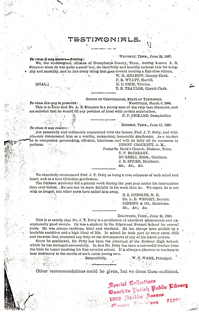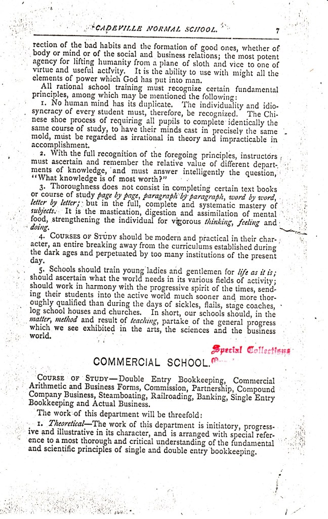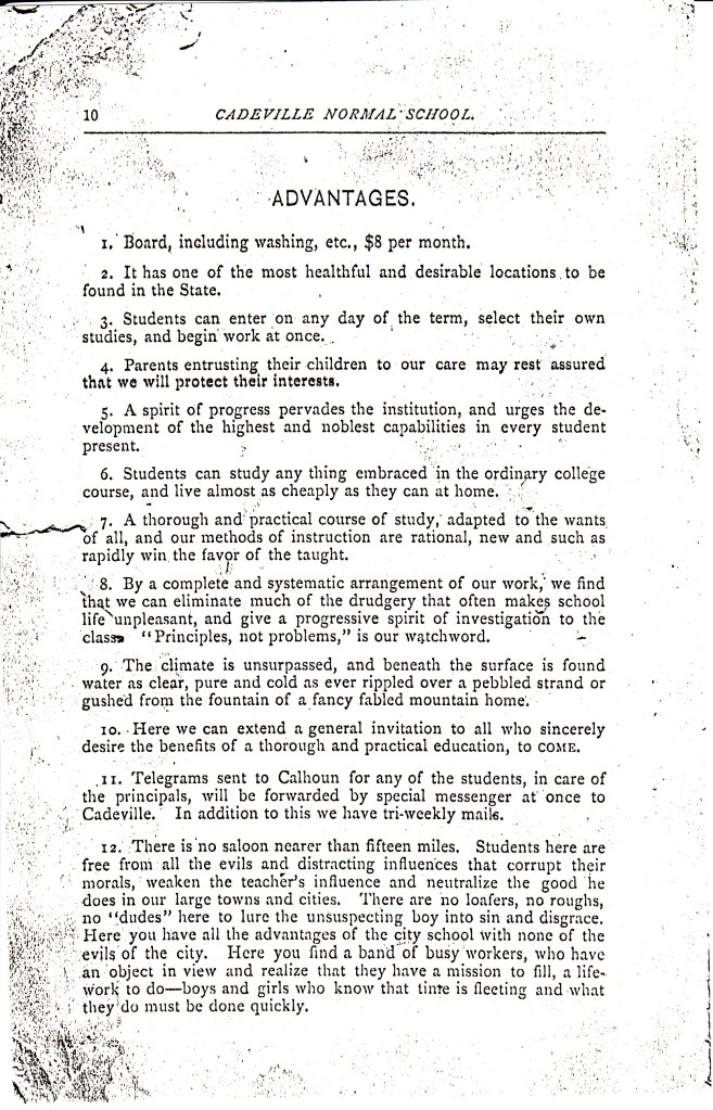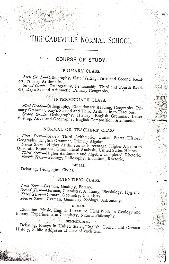 Did you know the little community of Cadeville once had a college? Yep! Found in the vertical files of the Special Collections Department was a copy of a catalog from the school year of 1889 – 1890. Take a look at that course load!