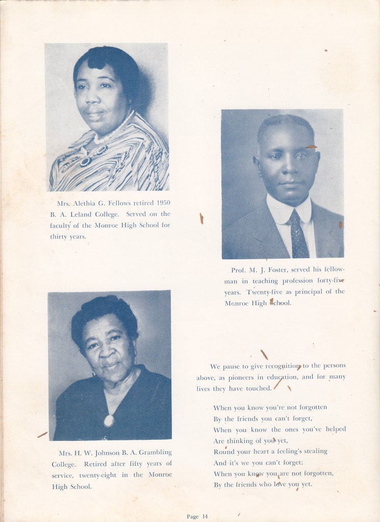This page was another jaw dropper! Looking out from this page is probably one of the biggest names in Ouachita Parish educational history. Professor M.J. Foster. WOW! Mrs. H.W. Johnson is Mrs. Henrietta Windham Johnson, whom a community center on Berg Jones Lane is named for. She taught for fifty years. That means she was on the faculty of Wisner School, which was the first African-American school in Ouachita Parish. [edit August 9, 2022: She was actually an Assistant Principal of Monroe Academy/North Louisiana Industrial High School under Professor Foster and became Principal after he left the school in 1920!]