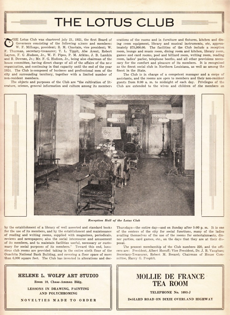 The below page comes from a magazine called “Monroe “Life””, published around 1925. It shows a photo of the interior of the Lotus Club, which is still operating at the top of the ONB building, known today as the Vantage building. The history written with the photo is quite interesting!