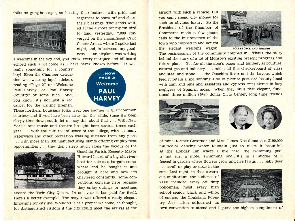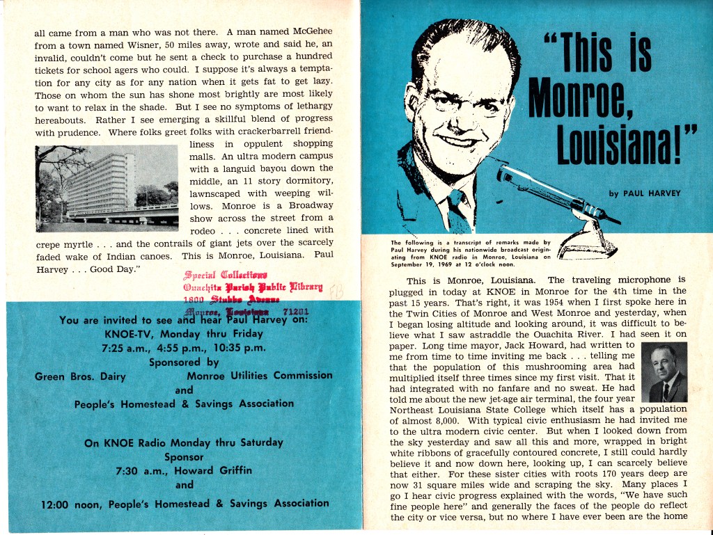 In 1969, Paul Harvey visited Monroe and did one of his radio programs from KNOE studios. Stuffed in the vertical files of the Ouachita Parish Public Library were several flyers which had a transcript of his speech that day. Coincidentally, Paul Harvey came to Monroe again in the 1980’s and was one of the very first in the area to use a portable cell phone!
