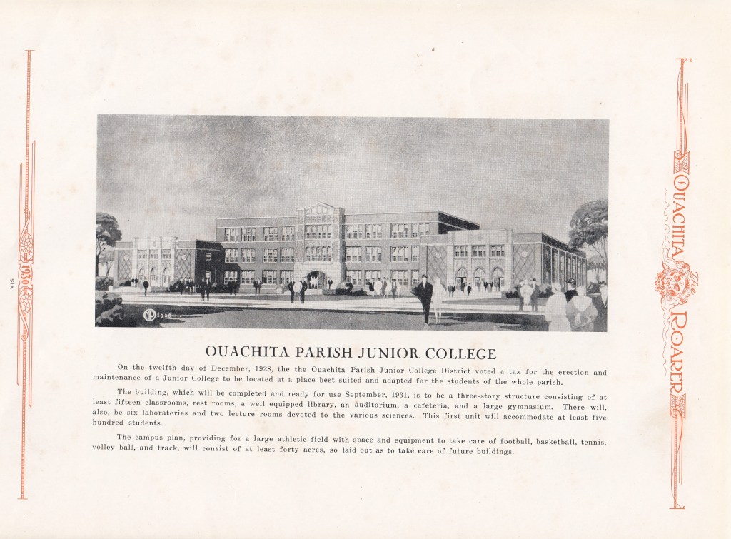 This is another page from the 1930 Roarer yearbook, showing the concept art for the new junior college going in on DeSiard Street. You may know it today as ULM! It would be a couple more years before it would open though.