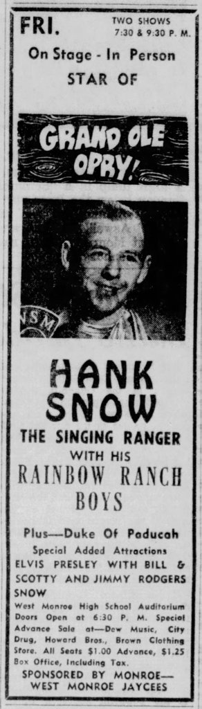 Hank Snow was nothing to sneeze at. If you know Country music, you know Hank as one of the big founding Opry stars. He was inducted into the Canadian and American Country Music Halls of Fame. He was a big star back in the 1950’s. But, if you read a little further in the above ad, listed in much smaller print was a small opening act for the concert. Yep. Elvis Presley with band mates Bill and Scotty. Hank had taken the talented trio on his tour as an opening act. He made a big mistake though. He introduced the young man to Tom Parker. The rest is history. This would be a mistake Hank would regret the rest of his life. It was the first time the King would visit Ouachita Parish, but wasn’t his last! When he came back, you can rest assured he had top billing!