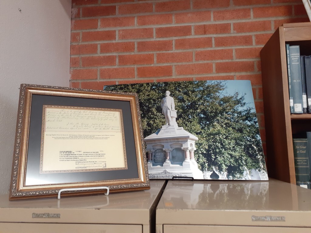 One of the things Mr. Booth uncovered was the misuse of public funds. In one of his reports, he said something to the effect of, “…and public funds were used to frame a marriage license!” I knew immediately what he was talking about. At the time, we had finally uncovered the marriage register of Sidney and Annie Livingston Saunders in St. Louis. No need to tell you who they are, since they are a well known legend around these parts! I used my own money to get a digitally scanned and color printed copy for us. I had it framed to hang for public display on our department wall for all to see. Nothing came of it, but inside I was seething! He was friends with my Dad’s childhood best friend, so when we were invited to watch the Mardi Gras parade at the friend’s business, it made things a little awkward. I kept my distance. The friend thought it was hilarious!