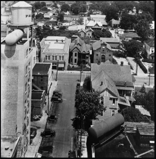 This is a very unique photo, looking straight up Harrison street all the way to Jackson. You can see the Jewish Temple with the ten commandment tablets at the top, with the Rabbi’s house next to it. The site is now where Frances Tower sits. You can see the Palace department store on the left. Judging from the angle, I would guess this was taken from the roof of the ONB building, circa early twenties.