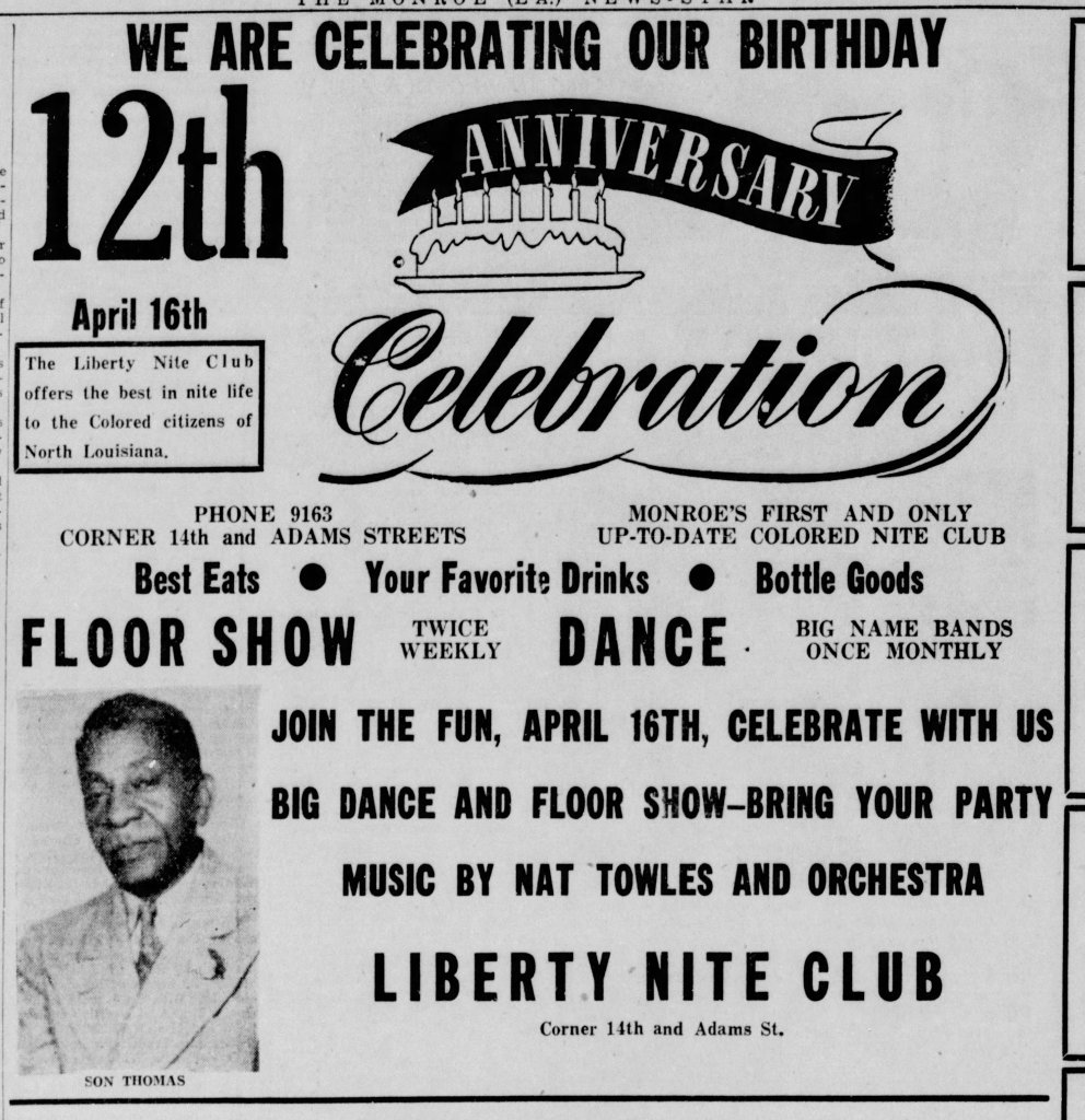 This is a very rare ad from 1946, for the Liberty Nite Club. It was very rare for black owned businesses to advertise in white owned newspapers! The Liberty was perhaps one of the most important music venues in the Monroe area. It was a stop on the Chitlin’ Circuit and was also renowned as the first Nightclub in Monroe!