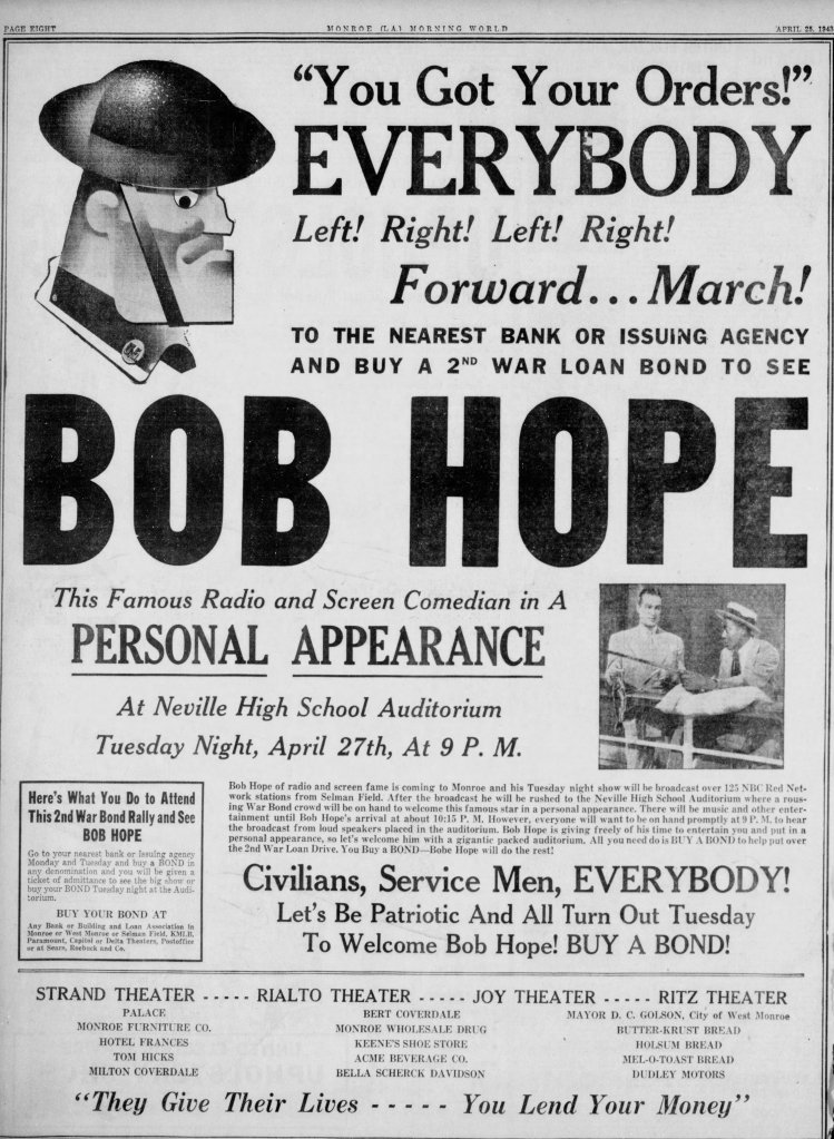 This is a full page ad asking locals to buy War Bonds. This was in 1943, in the middle of WWII. Everyone who did buy a bond, got a free ticket to see Bob Hope at the Neville auditorium! Bob came to Monroe several times over the years, performing at Selman Field, Neville Auditorium and the Civic Center. My parents have a blurry Super 8 film of him at the Civic Center when he came in the early 70’s!