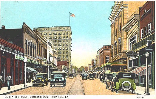 This shows the 300 block of DeSiard Street, looking west towards the river. The first building on the left was T. John, which was a clothing store. It was located at 328 DeSiard. Of course, the prominent buildings in the shot are the Theater on the right and the Ouachita National Bank Building on the left. Cool little postcard!