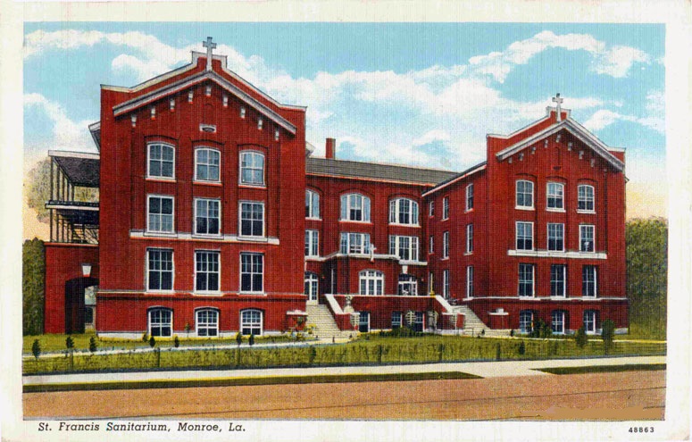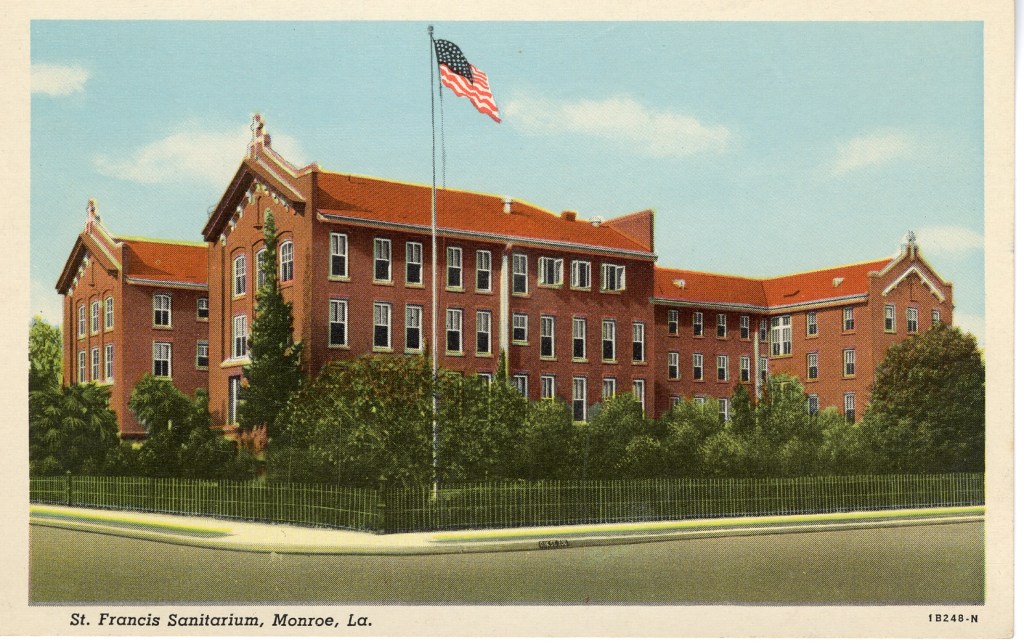 This postcard comes from the Brinsmade collection and will probably be added to the Louisiana Digital Library database. I don’t know the time period for this one, but I would guess the teens to the early twenties. Look at the flag’s star field. This was before Alaska and Hawaii became states. One of the curbs has the name of the street on it. This was very common in Monroe at the time. I’ve heard it said that the city didn’t maintain the grass on the sides of the road very well, so sometimes you had to stop the car, get out and part the grass to read what street you were on!