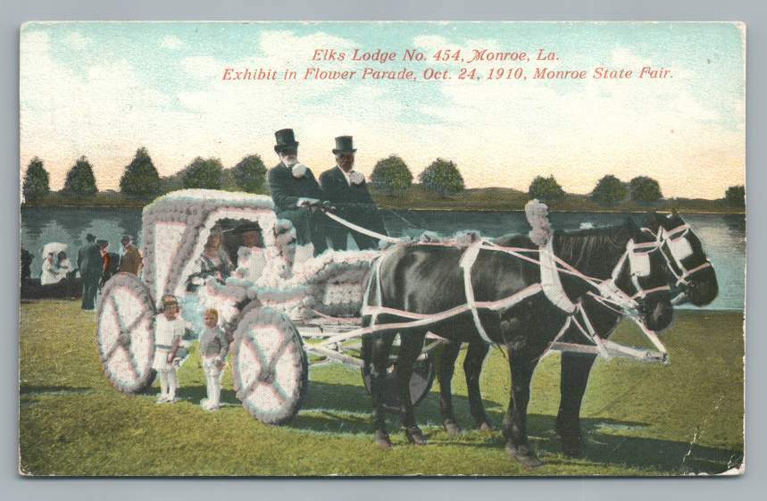 I have seen this one around. Today the photo turned 110 years old. Every year to kick off the Monroe Fair, there would be a parade through Monroe. The above was a “float” decked out in flowers. I don’t know where it was taken, but that looks like the Ouachita River in the background. Forsythe Park maybe? The fair was a huge deal in Monroe. The day it began, businesses closed and everyone came out. There was usually a circus that came as well! That year there was one of those spinning merry-go-round type rides designed to throw you off! I have seen footage of one that was at Coney Island in New York. It was very amusing entertainment to see what guy could hold on the longest! Sounds dangerous to me!