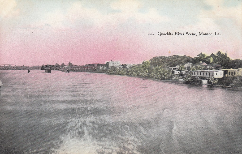 Last week I was the winning bid on several Monroe related postcards. I’ll be sharing them with you over the next several days. This one is a great hand colored photo taken looking back at the Endom Bridge. Very pretty! Did you catch the misspelling?