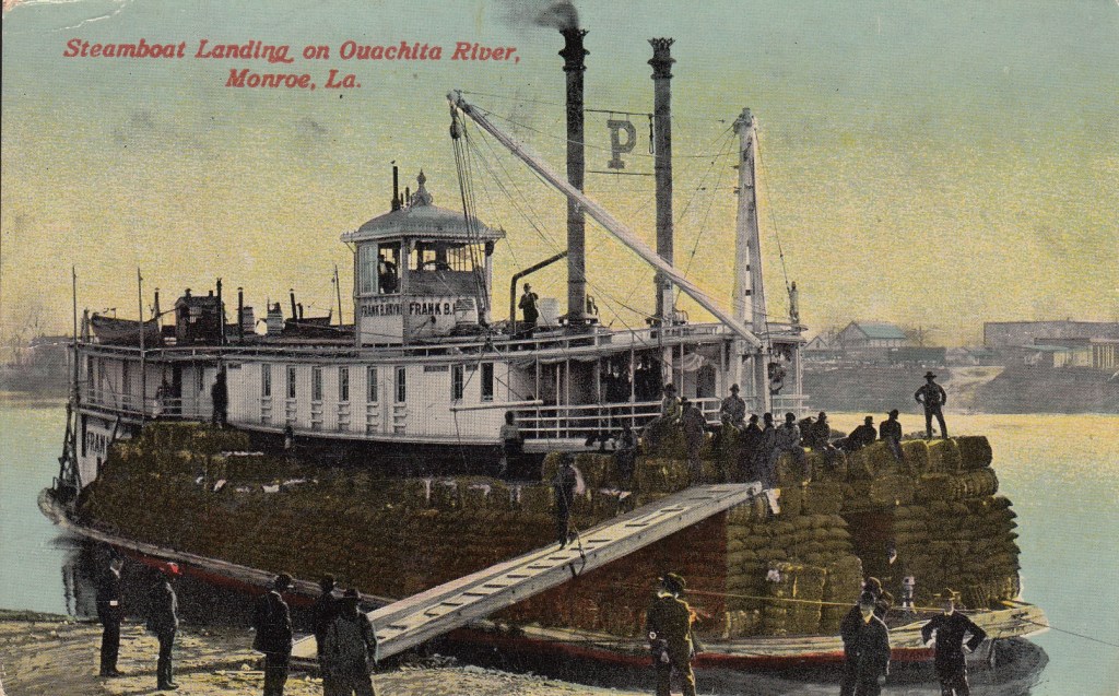 The Frank B. Hayne was built in Jeffersonville, Indiana in 1904 for the John P. Parker line (hence the big “P” between the smokestacks). It had the machinery from the old Parlor City steamboat (built in 1892) that had sunk in 1902 at New Orleans due to a collision with the Natchez. The Hayne ran up and down the Ouachita river until it was sold in 1908 and renamed the Alice B. Miller. She burned at Vicksburg in 1915.