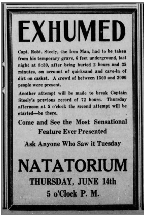 Yep. Stunts like the above were all the rage in the 20’s. This particular one happened in 1928. His second attempt was more successful. He exceeded his old record of 72 hours by fifteen minutes. He was dug up, the “coffin” carried to the Pavilion and opened. Steely was a little weak and shaky, but otherwise fine after his ordeal.