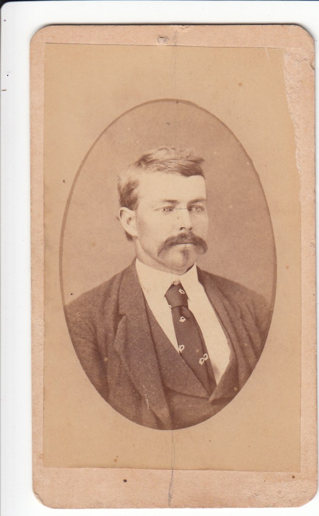 How do I know it is a Jamar family member? Written on the back is the name, J.J. Jamar. I have hunted through the census records, but nothing fits perfectly. However, there was one man in the family named Joseph Frederick Jamar. He was born in 1850, married his younger brother Abe’s widow and moved to Lonoke county, AR where he died in 1930. Could the above photo be Joseph? I don’t know. Still, it is a very interesting “likeness”! I almost expect him to speak from the photo, “I’m your huckleberry!”