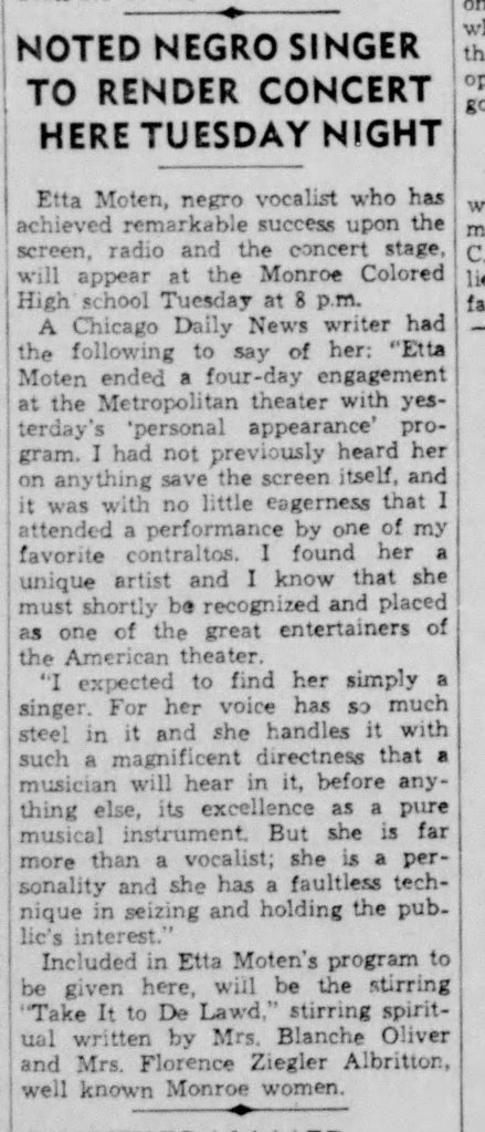 Never heard of Etta Moten? Neither did I until I looked her up. Ms. Moten was the first black actress to appear on screen in a roll other than as a Mammy or Maid. She was a philanthropist and activist. She is best known for a little Gershwin Broadway play called, Porgy and Bess. She created the role of Bess. I am very surprised such an important singer agreed to sing a local composition! Look at who wrote it! This concert would have taken place on January 4, 1938.