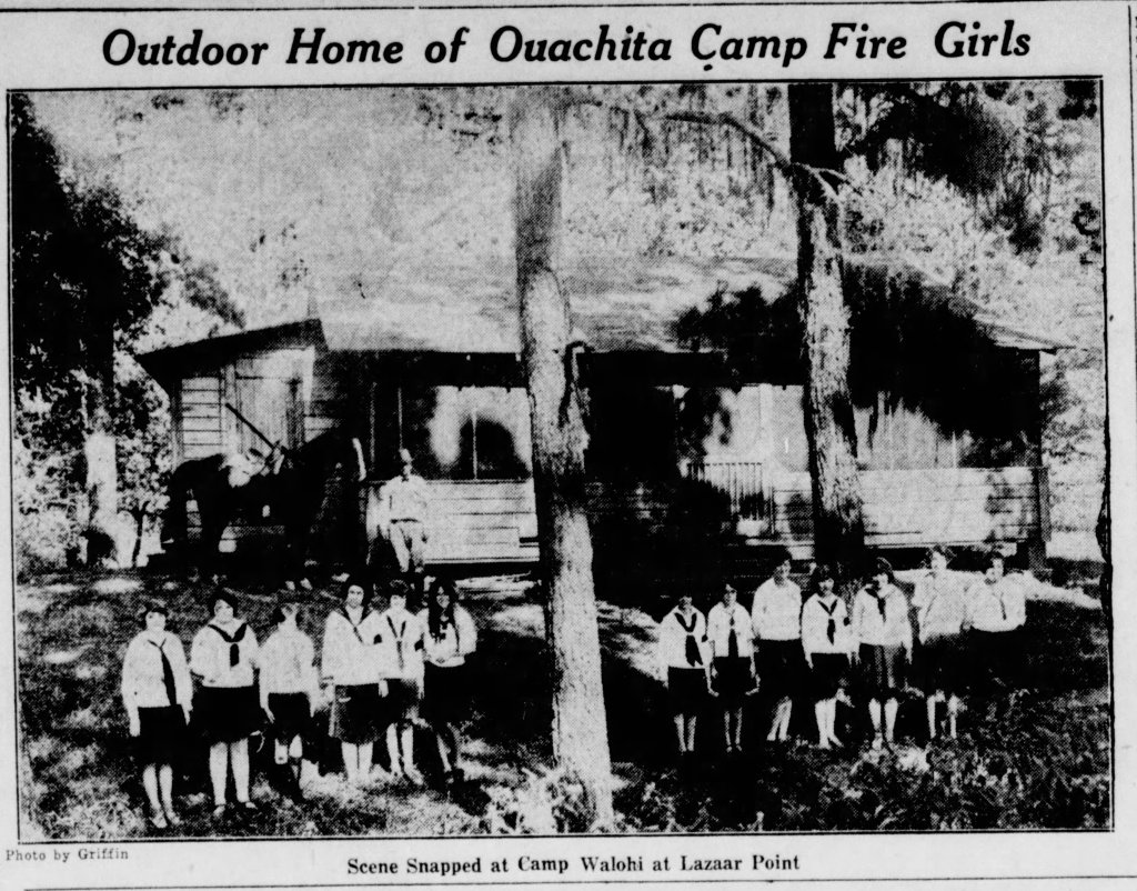 The Boy Scouts had Camp Ki-Ro-Li, but the Campfire Girls had Camp Walohi. W.R. Mitchell donated the land and the public donated the funds to build the buildings. By 1924 it was ready. The 1927 flood put three feet of water in the building, which floated the wood floorboards and busted out the windows. Repairs were made and the girls helped paint the walls.