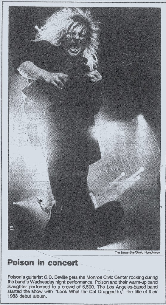 One of the biggest hair bands during my high school and college years was Poison. I was a hair band fan, thanks to my boyfriend at the time being a metal head. Back in early 1991 I was finishing up my Freshman year of college when NLU announced that Poison, with opening band Slaughter would make a stop in Monroe and perform at the Civic Center. Tickets for students were only $10. My friends and I quickly got tickets for us and our dates. I think there ended up being about six of us. The floor was general admission but seats were set out bolted to the floor to prevent a crush at the stage. People were not allowed to stand in the aisles. This was my very first concert. It was magical! I will never forget my date and I slipping off to try to get closer to the stage on the side. We got there just in time to catch one of C.C.’s guitar solos up close. That was something I will never forget. My date slipped behind me, put his arms around me and rested his chin on my shoulder. We stood there in awe watching C.C. work his magic. What a memory. A poster from this concert hangs behind a check out register in an Antique Alley store. Every time I go in there, seeing it makes me smile and remember. Today would have been my date that night’s 48th birthday. He passed away a few years ago. Happy birthday, wherever you are!