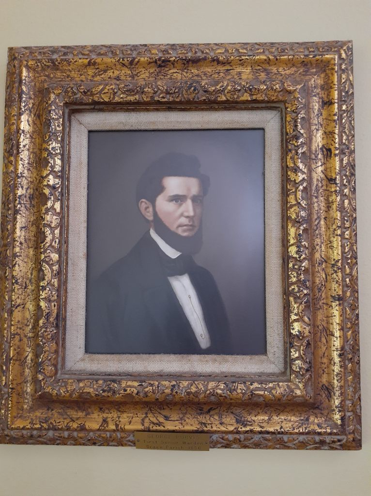 George Purvis was a native of England but settled in the Ouachita Parish area before the Civil War. He married Carolyn K. Morrison (from a very old Ouachita Parish family) and they were the parents of several children. When I was inside Grace Episcopal Church earlier this year, I saw a painting of George hanging on the wall of their fellowship hall. I made a snapshot of the painting: