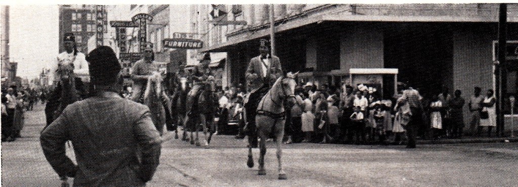 I found this photo in an old magazine. It shows some area Shriners riding horseback down DeSiard Street in the 1961 Monroe Rodeo Parade. The man with his back to the camera is identified as Noble M.A. “Doc” Ehrhardt. One of the men riding in the front may be Assistant Rabban Ed Clark, who was leading the parade.