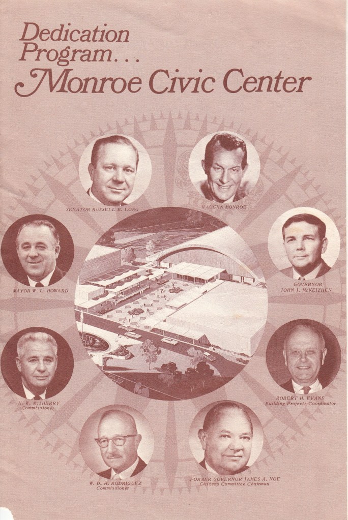 On September 2, 1967, the Monroe Civic Center formally opened to the public. I found the following program for sale on Ebay and bought it. The small strips were flaps on the end of the back page/cover. I will be donating it to the library for preservation.