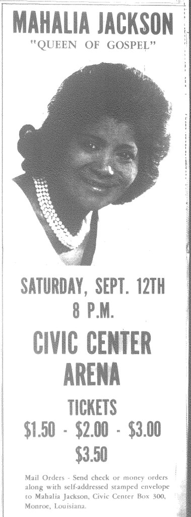 In 1970, the Queen of Gospel herself, Mahalia Jackson sang at the Monroe Civic Center. Mayor Jack Howard presented her with a Pacemaker Bracelet and rolled out the red carpet for her. Mrs. Irma DeTiege took her around town and they made visits to several local pastors in the area. Among the songs Mrs. Jackson sang at the Civic Center that night were: Will the Lord Remember me, The Lord’s Prayer, How Great Thou Art, How We Got Over, Precious Lord and We Shall Overcome. At the end of the concert, Mayor Howard presented her with a dozen red roses! However, this was not her first concert in Monroe! Ms. Jackson previously came to Monroe for a concert at the Carroll Gym in 1949. A little over a year after her last Monroe concert, Ms. Jackson would pass away at the young age of 60.