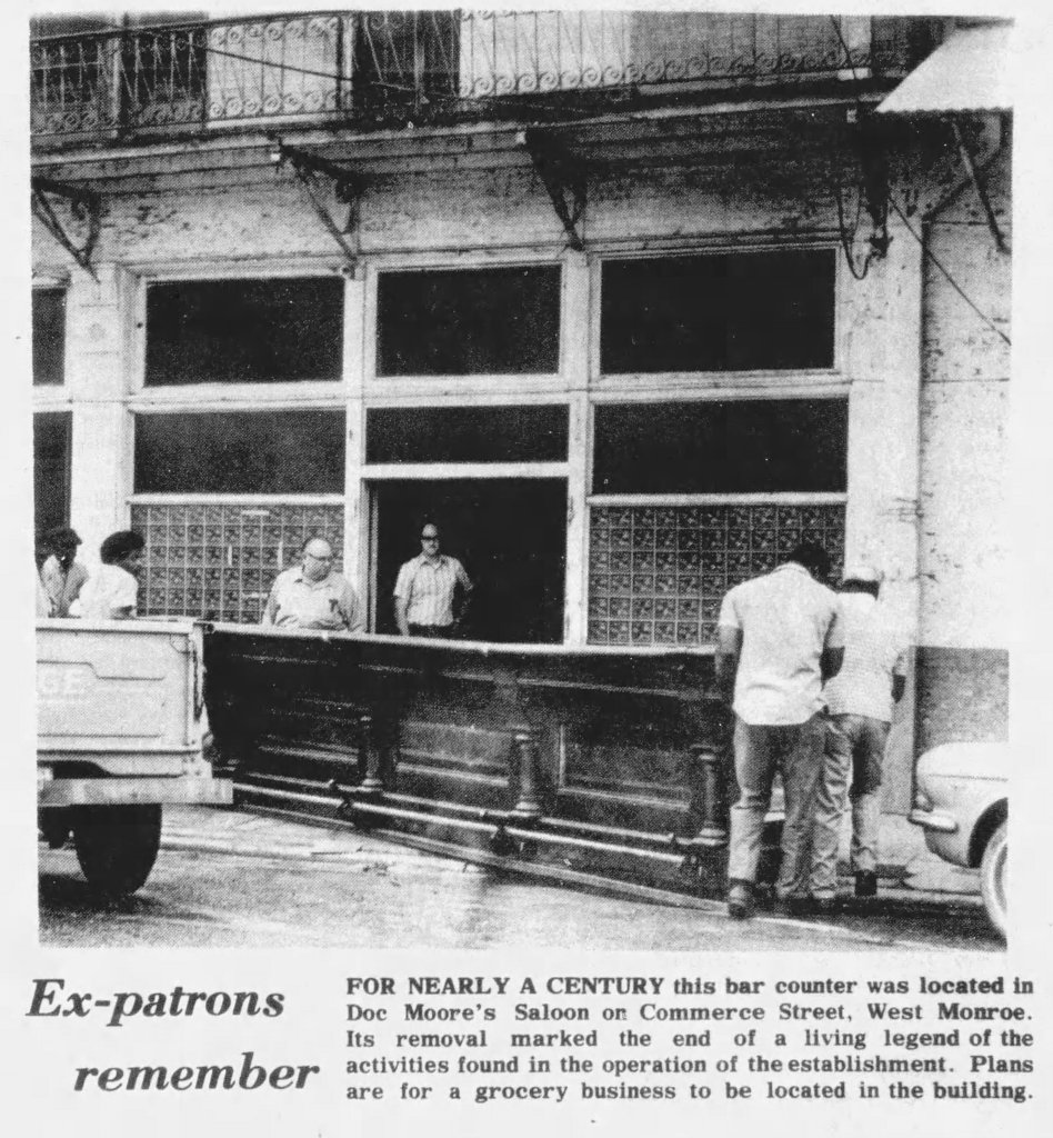 This clipping makes my jaw drop. It is a photo from the Citizen in 1972, just a few days before I would be born just right across the river! It shows men carrying out the bar from the old Doc’s Saloon on Commerce Street in West Monroe. I wish Ron Downing was still alive so I could ask him what happened to it! He would know!