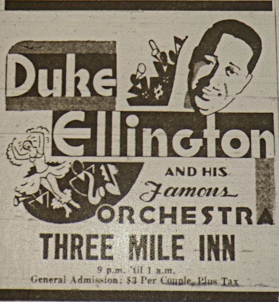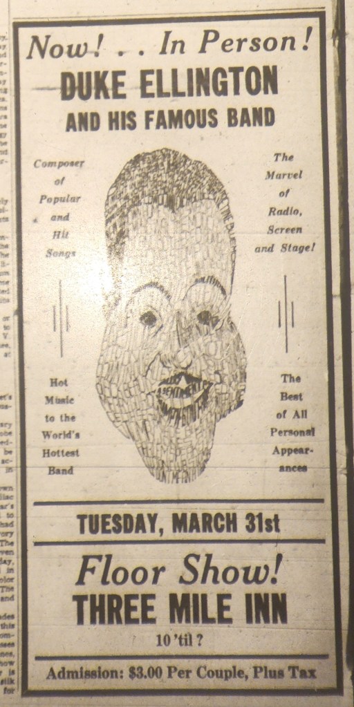 As I write this, I am researching the local music venues that were here before the Civic Center. I am limited to newspapers.com, which makes it easy to search through the years. I saw an article at the end of the year 1936, discussing acts that came through at the Three Mile Inn, which is now the Waterfront Grill. My jaw dropped when I read Duke Ellington and his band had been there in March! Newspapers.com doesn’t have January – March digitized, so I had to browse through them on the microfilm machine. BINGO! He was here March 31, 1936. WOW! I did an inflation conversion using the 1936 $3 per couple price, and in 2023 dollars, that would be $66.43 before tax.