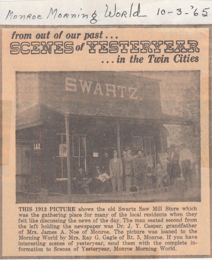 This clipping came from the Monroe Morning World in 1965. Note the caption misspelled “Cosper”. J.Y. Cosper was the grandfather of Anna Grey Noe. Cosper cemetery was named for him and his family, since they were once buried out there. Mrs. Noe had the Cospers and other family members disinterred and then entombed at Mulhearn Cemetery’s mausoleum.