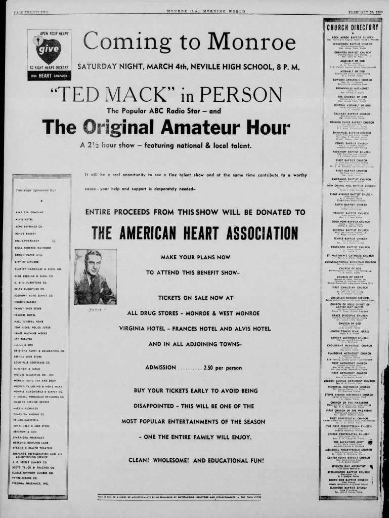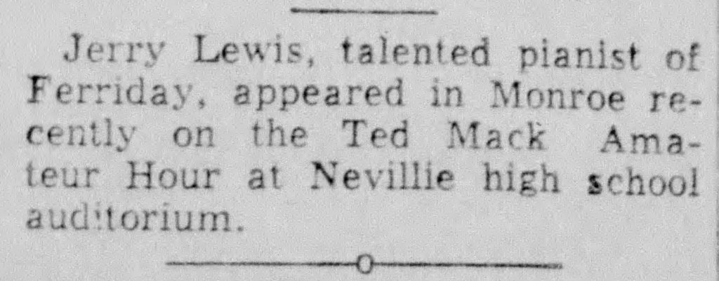 Back in 1950, the nationally known “Ted Mack Amateur Hour” came to Monroe. Think “American Idol” but kinder. It is said Ted Mack’s show originated the idea for talent shows on air! Anyway, a fourteen year old kid named Jerry Lee Lewis from Ferriday performed on the piano in the show. I have never heard how he did! The world wouldn’t know what hit them for another six or seven years!
