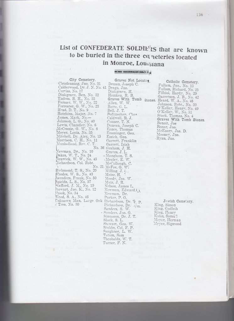 Bear with me as I explain this. Ever since I got the list of Monroe UCV members, I’ve been furiously researching them. Not just the founding members. All of them. Too much to go into at the moment. Lets just say, I have a list of about 160 names I am researching. Anyway, looking back at the book we have on who got the Southern Cross of Honor in Monroe, which I’m using in my research, I found this list again, which I have shared before (See the “Confederate Soldiers Buried in Three Cemeteries” post):