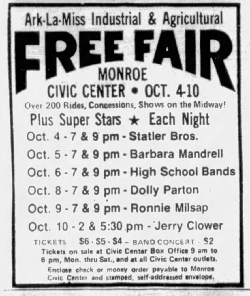 In my research on one of the artists, I found this ad for concerts at the Civic Center while the fair was going on. My mouth fell open and I shook my head in shock at the music legends listed here! Jerry Clower was a comedy legend! Ike and Tina Turner were also supposed to perform one night, but apparently something happened. $30 would have gotten you premium seats for all of them!