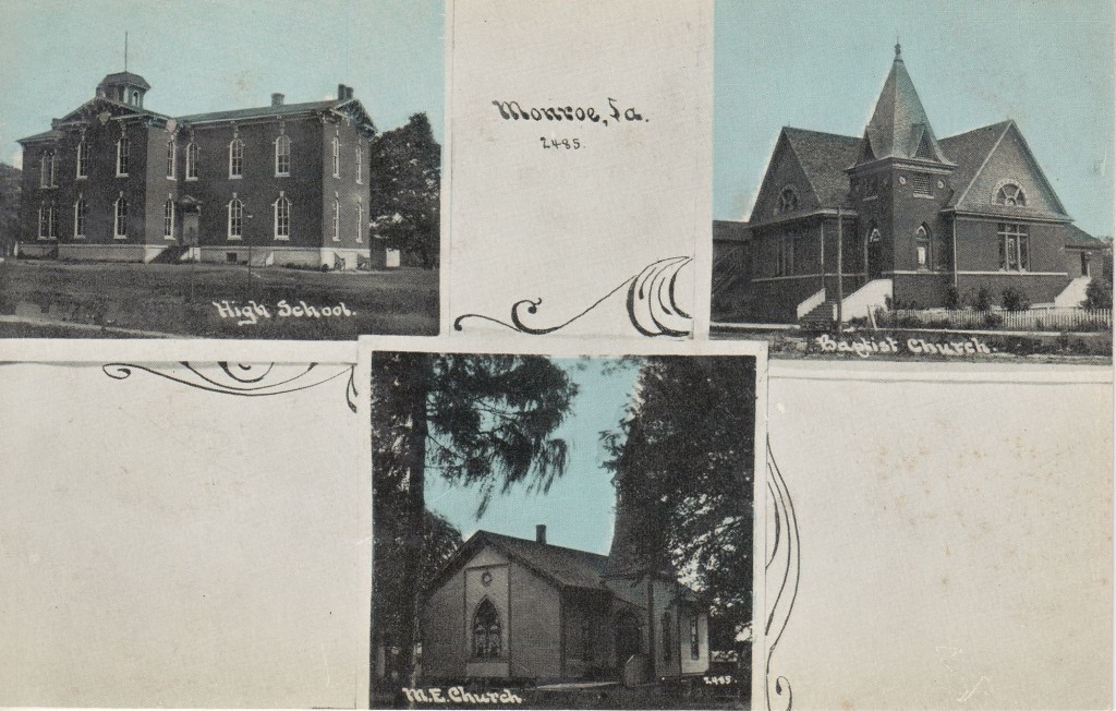 I bought the above postcard, which came up for sale on Ebay, advertised as a postcard from Monroe, LA. As I began to research it, nothing looked right. It says “Monroe, LA”, but the buildings are nothing I recognize. That is not the Monroe City High School. Those church buildings are not right. Then I looked harder at the L in Monroe, La. I looked up other towns of Monroe in the US and there is a Monroe, Iowa. That “La” that the seller and I thought was Louisiana, is actually (I think) “Ia”… Iowa! Always research before you buy and buyer beware!