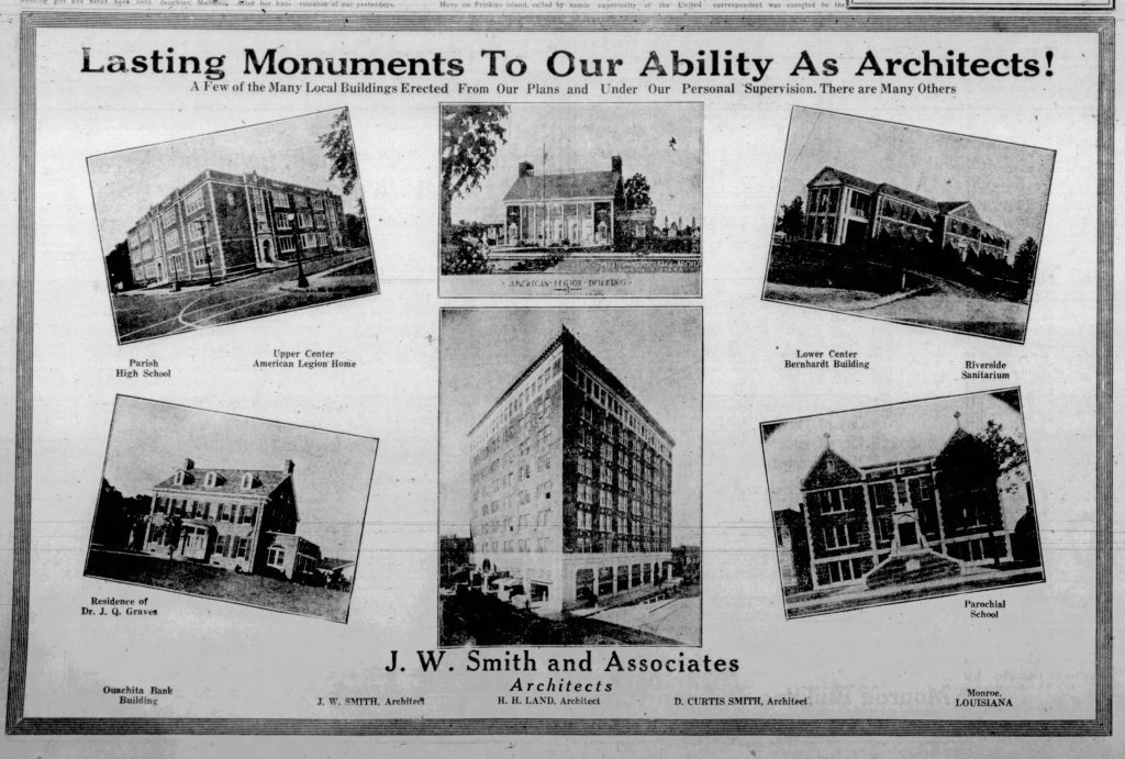 November 25, 1929 ad from the News-Star for J.W. Smith and Associates architectural firm. They are advertising some of the buildings they have designed and built. The High School (now the Grand Plaza), the American Legion building and the Bernhardt building (141 Lofts) are the only ones still standing. What caught my attention is the name at the bottom center, Mr. H.H. Land. Land 3 Architect is the oldest architectural firm in Northeast Louisiana. The firm is currently on the third generation of architects!