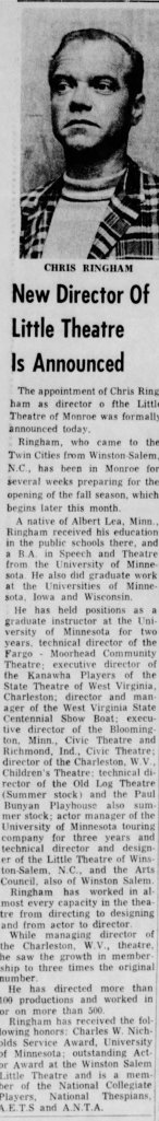 I love this video! It was filmed back in 1997 for the LPB program, “Louisiana: the State We’re In”. It is a wonderful profile of one of Monroe’s most colorful characters, Little Theatre director, Chris Ringham. I met Chris a few times when a friend performed in some of his plays and he was wonderfully entertaining! Chris was hired in 1968 to direct the theatre and he stayed in that role up until his passing in 2003. He loved the theatre so much his ashes were buried in the courtyard next to the building and his spirit is said to haunt the theatre!