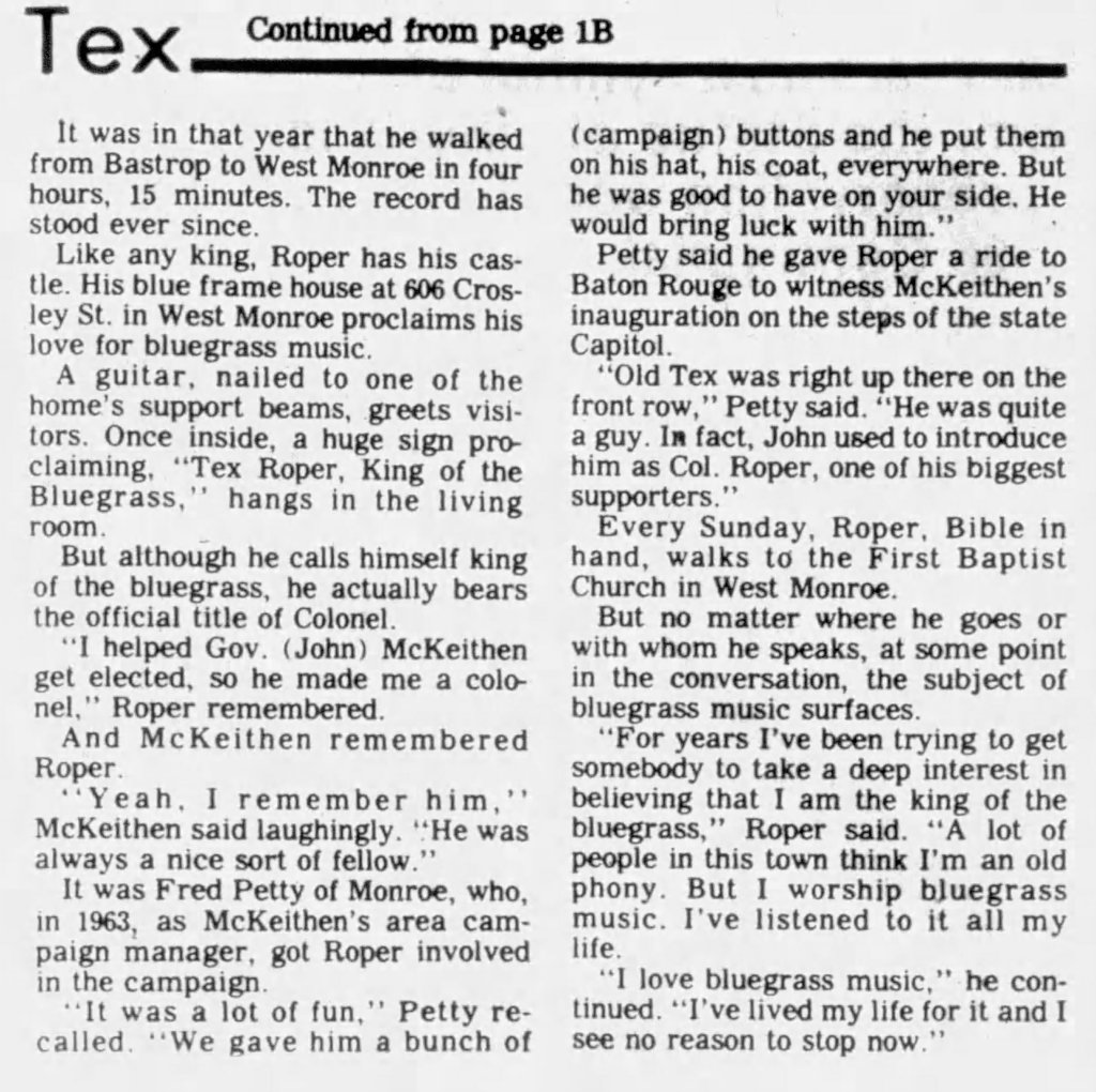I see that people are still pulling up my article about Grover Daniel “Tex” Roper, Jr., so I thought since people were still interested in him, I would share another article. This one was published in the News Star on January 7, 1985, three months before his death.