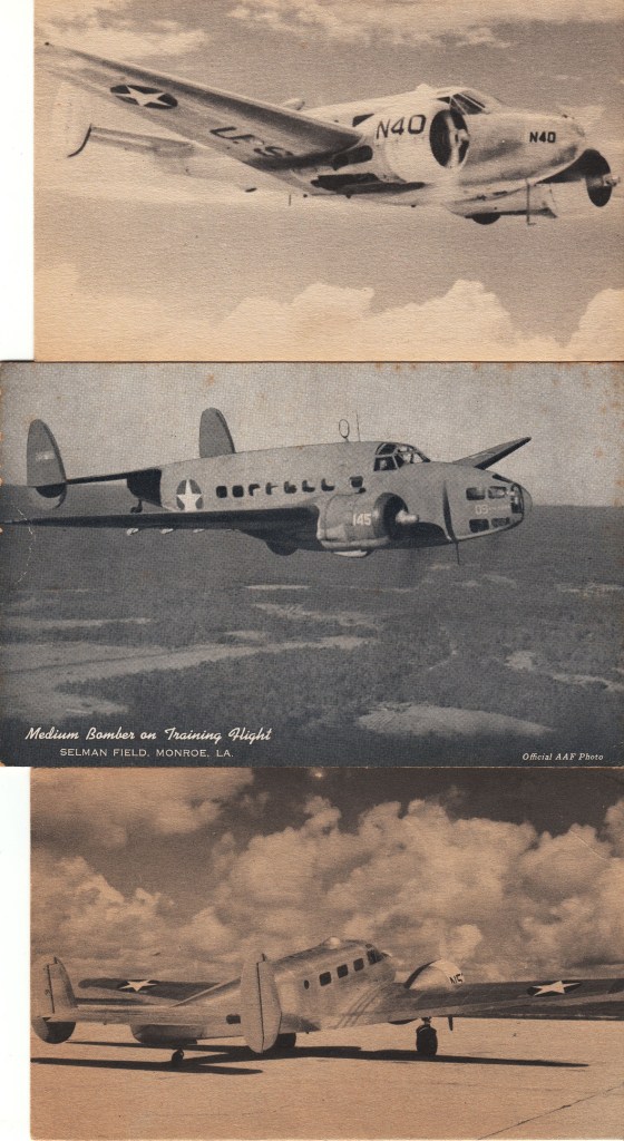 Over the years of collecting, I have found a small handful of postcards that were sent from Selman Field during WWII. The three above are from my collection. These are the planes men attending the navigation school were training on.
