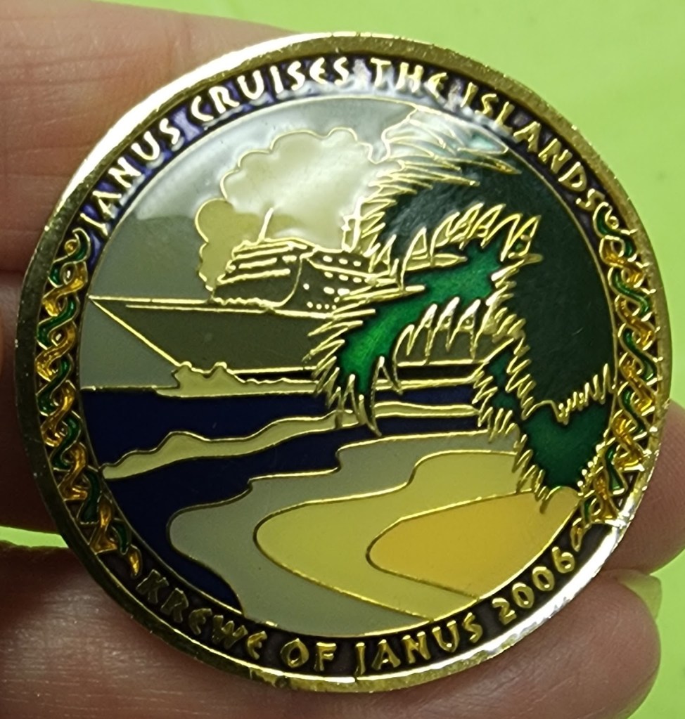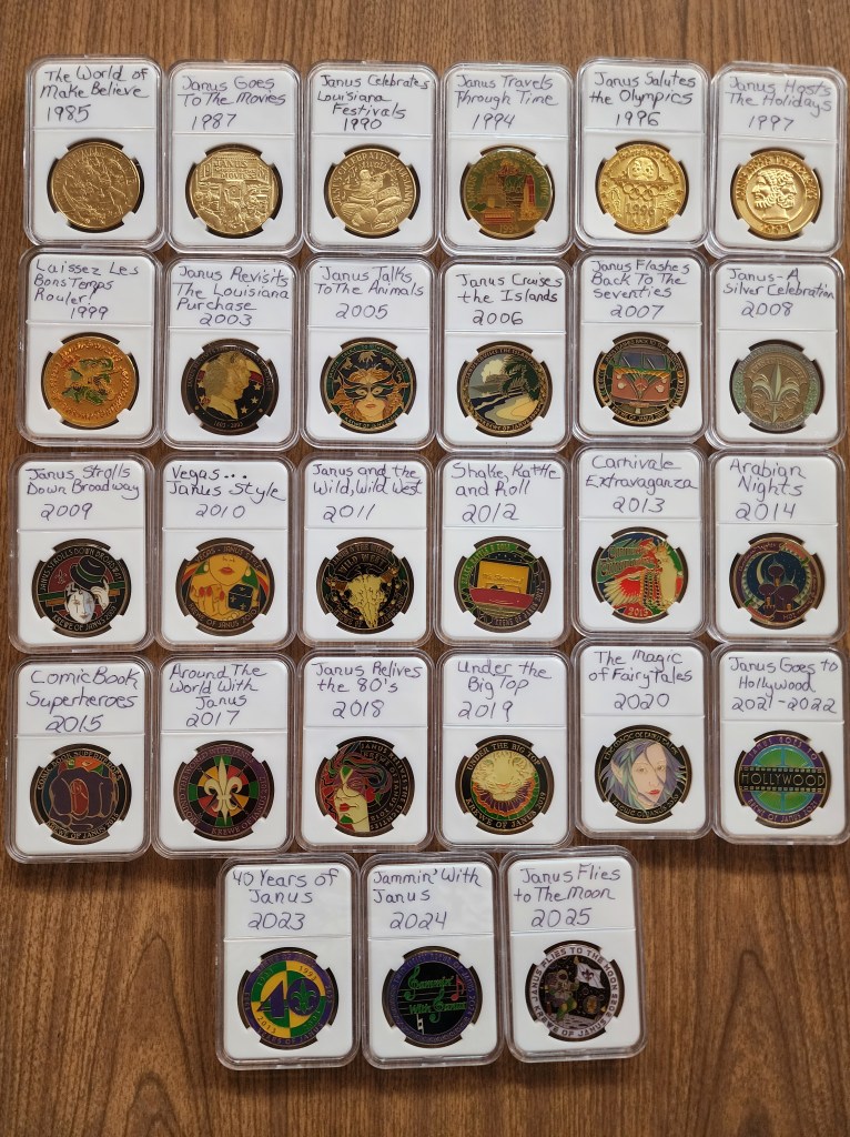 Each year at the Krewe of Janus Grand Ball, krewe members are presented with a heavy doubloon called a cloisonne. They are about the size of a silver dollar but thicker and heavier. It has the current theme on the front and the Krewe logo on the back. They are gorgeous and also rare, since only Krewe members can receive them. I have been collecting them ever since I joined the Krewe in 2017. Some I have gotten as a member, some I have bought from various sources. They are SO rare to find! I asked a couple of the remaining founding members at the last meeting and they think the first one was done in 1985 for the second year. They are going to have to check their collections and get back to me. As you can see here, I have over half of them; twenty-seven in all. My earliest one is from 1985, the second year of the Krewe. I have scanned my collection to share below, showing the fronts and backs of each. Sorry about the quality! My scanner isn’t that good! I had to lighten the scan because it was too dark. These are SO gorgeous and vibrant in person! If you hear of anyone wanting to get rid of their collection, let me know!