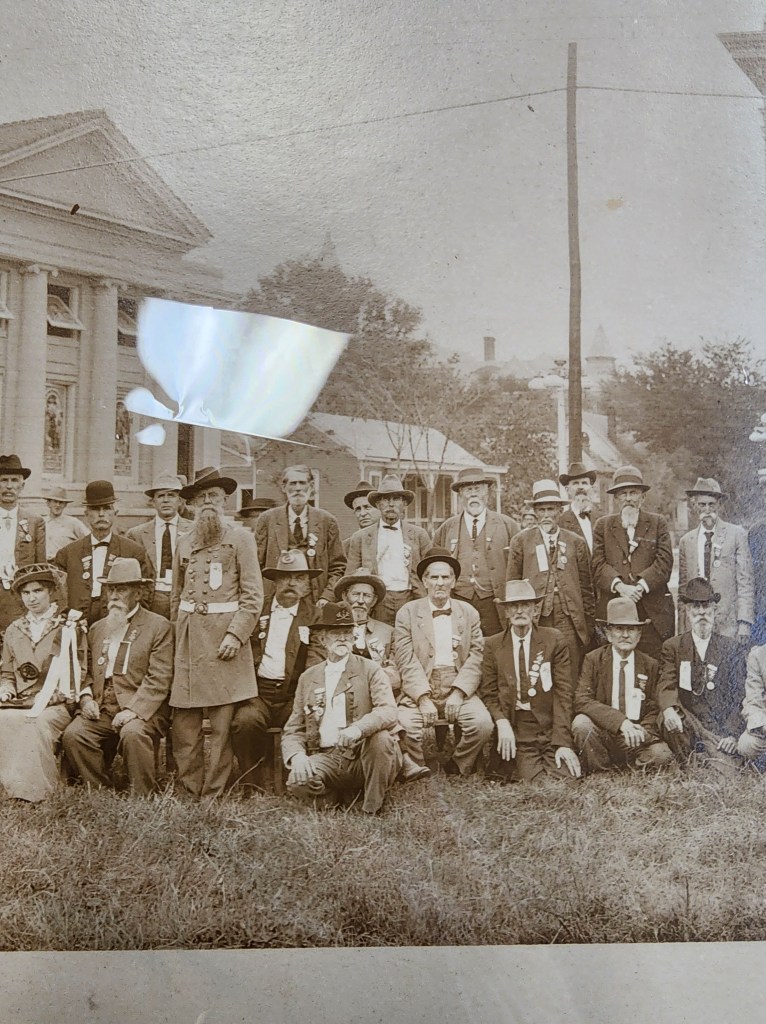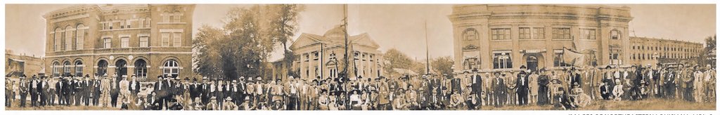 The man sitting on the ground is identified as George Washington Owens. He was the father of the S.C.V. man identified above. The man third from the left, bare headed looks a lot like Marion Elza Frost. The short man in the back directly under the light pole looks like it may be Jacob Allen Coon, but I could be wrong. He also looks like Mayor Fred Endom (they both have the rounded face and look similar).