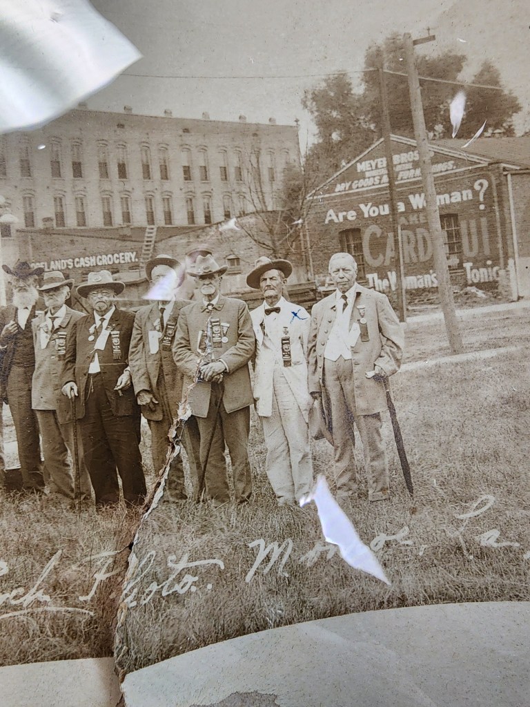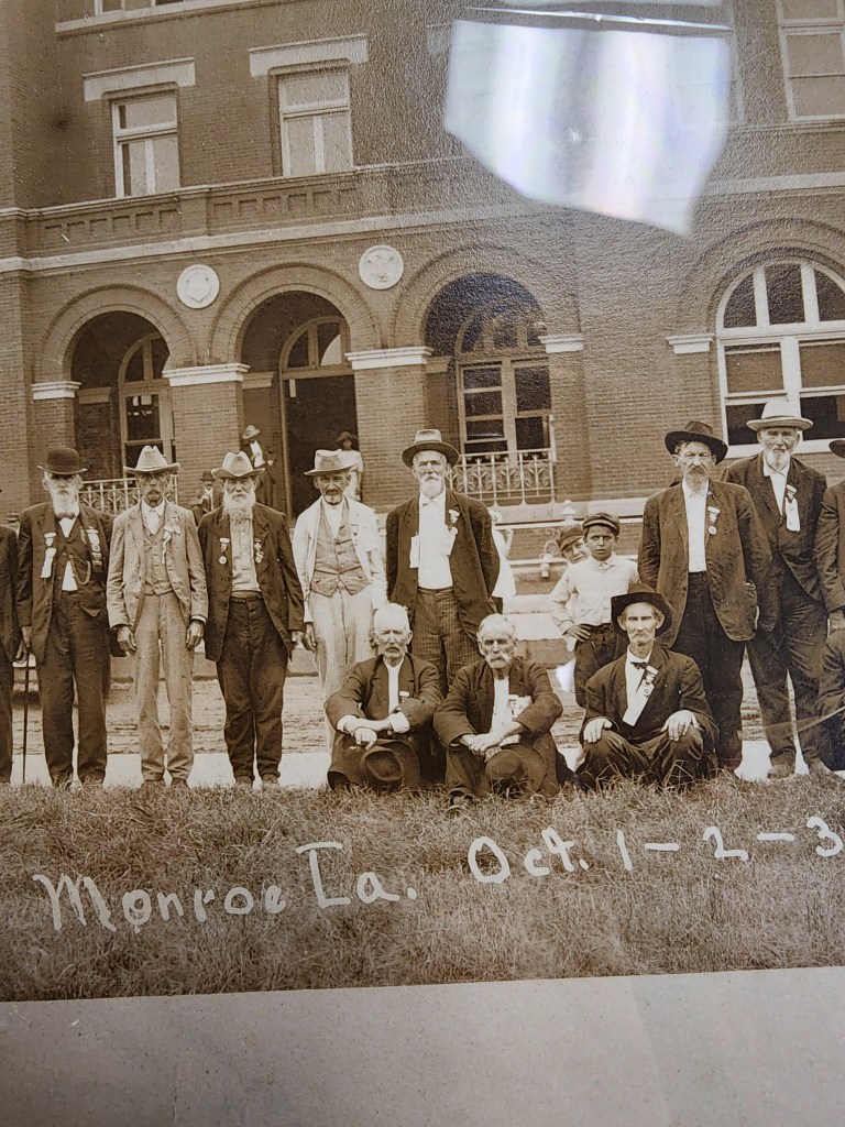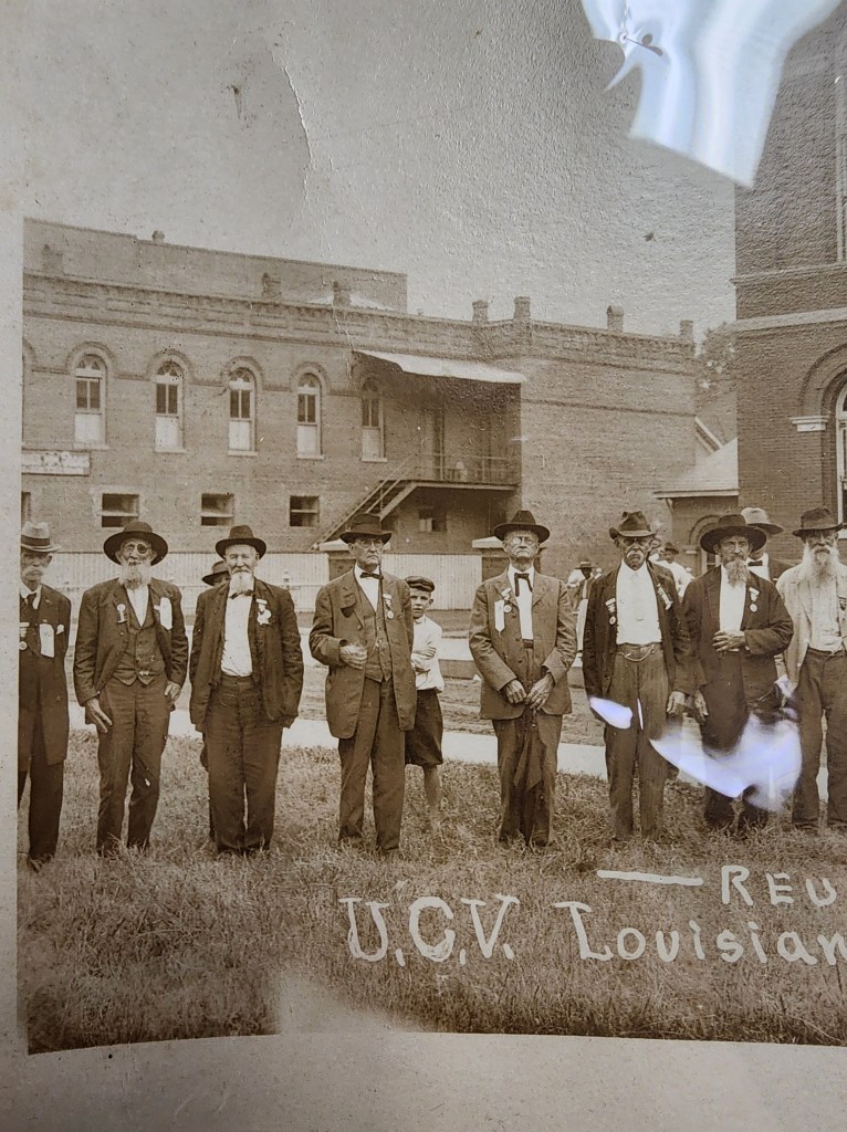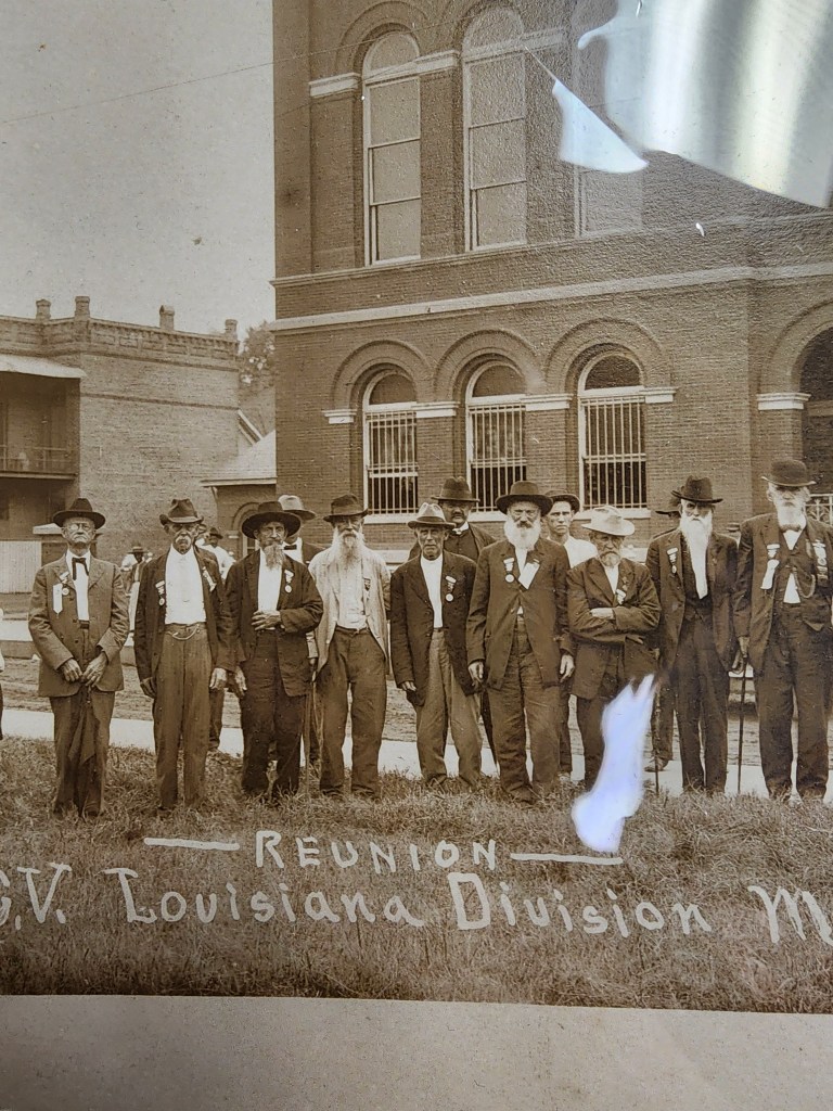 Back in 2018, I made a post about the above photo. You really can’t make out who anyone in the photo is, because it is scanned so small. The photo itself is very long, as you can tell. I decided to go to the Special Collections department, where the original is housed, and take close up photos of it in sections. A few people have been identified through the years. If you recognize anyone, let me know! We would like to identify as many as possible. Sorry for the glare in places. You can tell the photo is damaged, so it is protected in an acid free plastic sleeve. I have guessed at a few of these men, which are usually prefaced with “looks like”. I’m using their photos on their Findagrave memorials to compare. Some names of men I am sure are in there somewhere, but are not identified: Frank Stubbs, Thomas McGuire, Dr. D.H. Key, John M. Breard, Sr., and Judge Americanus Willis to name a few. Men and women came from all over the state to attend, so these are not just Monroe people. According to an out of town attendee, over 450 veterans attended. Using state papers in the newspapers.com database, I made a list of attendees you can view here: https://docs.google.com/spreadsheets/d/1JI7OkimjaEWKQnGnx3mfkcfD0blXI958jxxx7EAZOcY/edit?usp=sharing