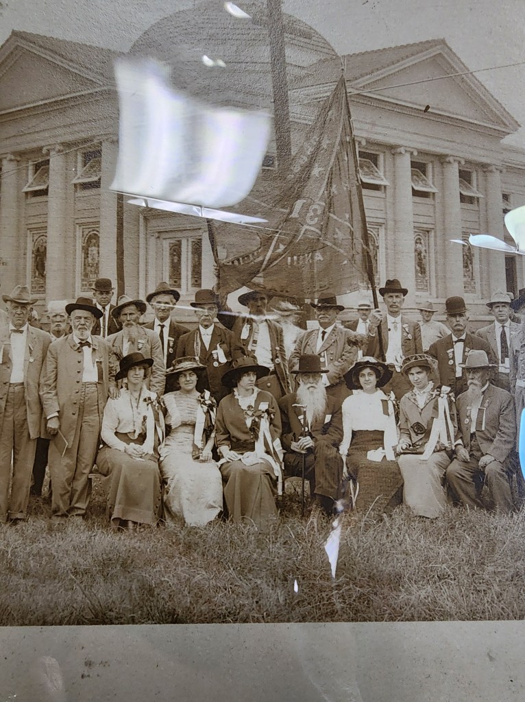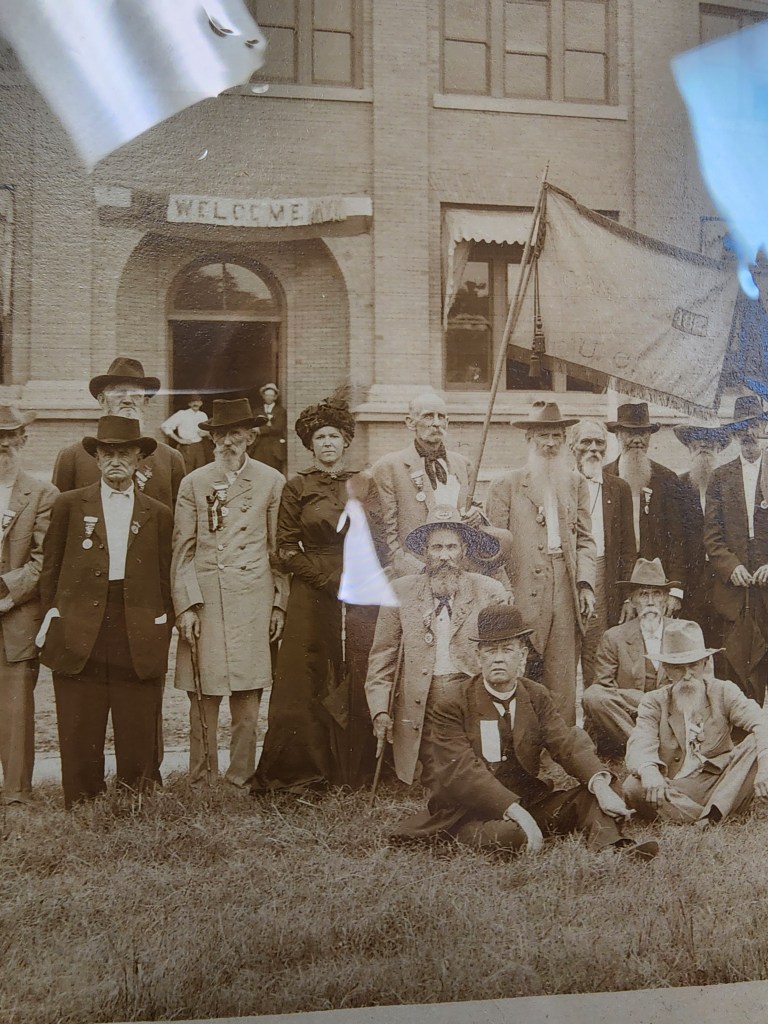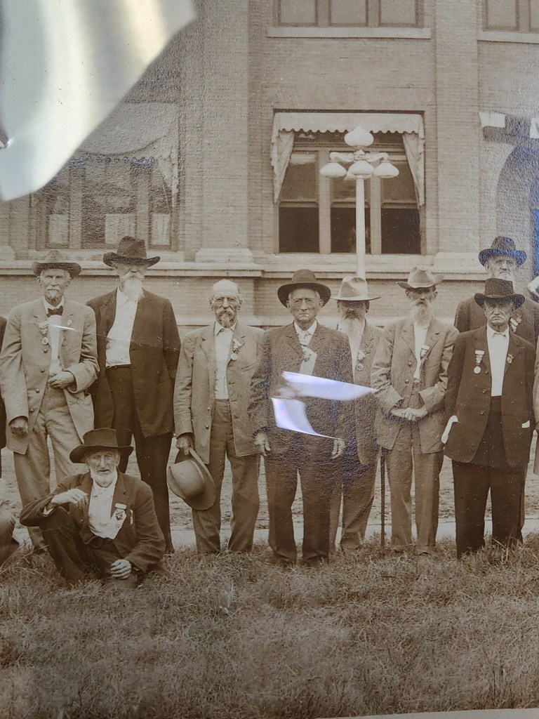 The man standing in the doorway next to the lady in black is none other than Captain Alex Myatt. He lost an eye at Vicksburg and you can see if you look closely, he is wearing a bandage over one eye! The man standing next to him is Alf Wells, a veteran from Lytle, TX and a friend of the Captain. Another locally famous figure is the man in black, sitting on the front row in the derby hat. That is Mayor Andrew Alexander Forsythe. The man holding the flag of what I think is the Henry W. Allen Chapter U.C.V. is William Henry Awl. He would later become the commander of the camp. Notice Mayor Forsythe and the man standing over his left shoulder have cigars in their hands!