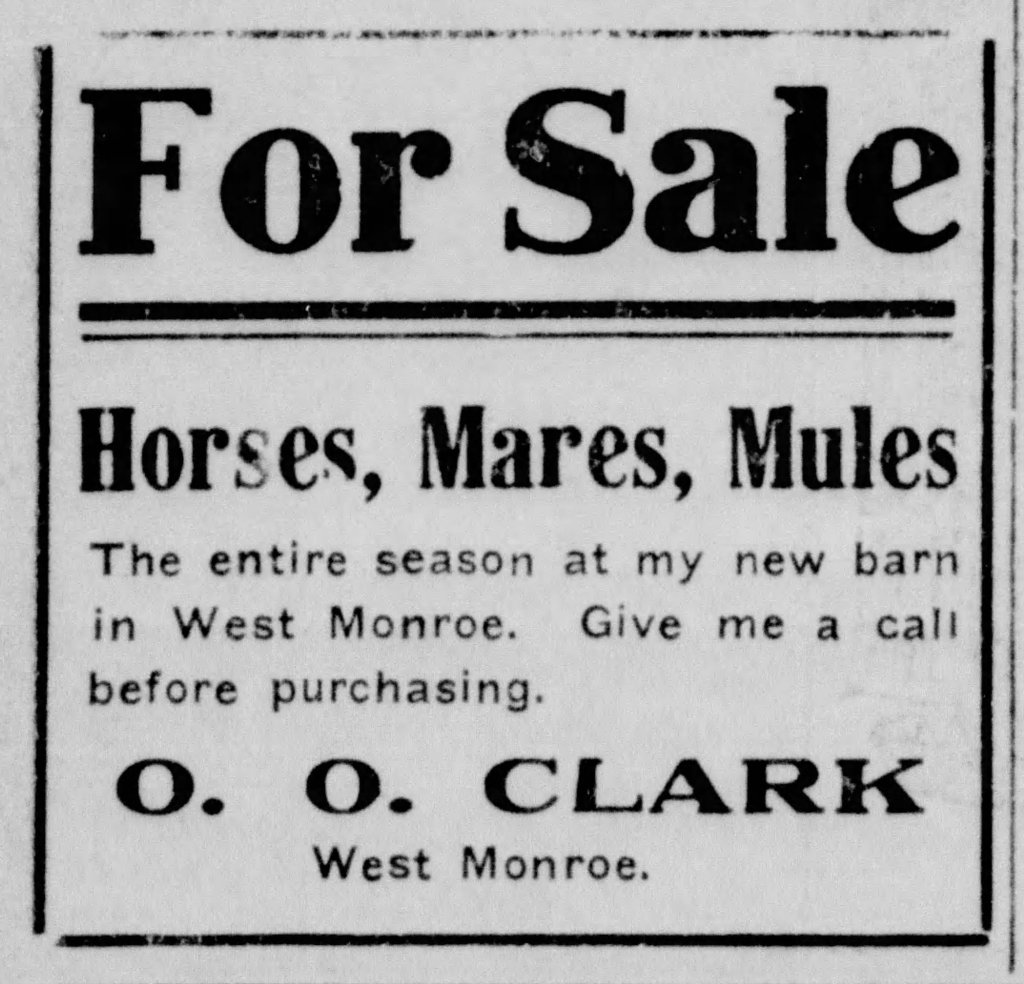 Another old landmark is gone from West Monroe. For years it stood, the city’s largest building, at the conjunction of Wood and Riverfront streets. Built many years ago, before the days of tractors, trucks and passenger cars, it was headquarters for the stockmen of this section and in its day has housed thousands of horses and mules on their way from Missouri and other states to the farms and industrial centers of Northeast Louisiana.